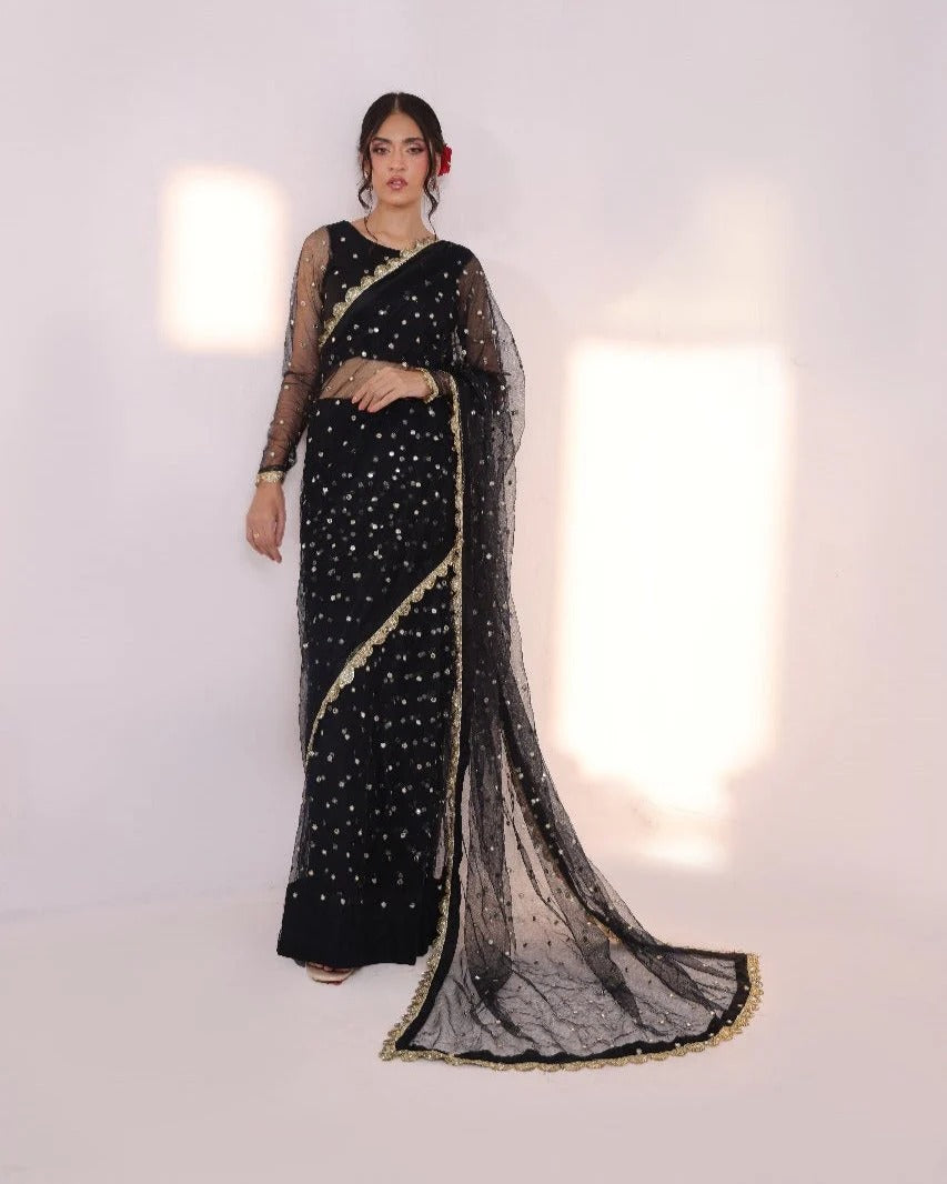 Description3 PIECE Net SareeNet Blouse Malayi Crepe Petticoat DETAILSA stunning black embroidered saree crafted from delicate net...