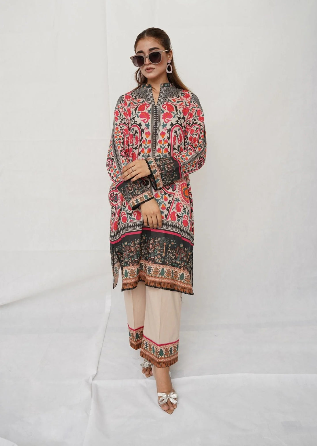 This chic 2-piece set features an embroidered long shirt with full sleeves, paired with flared...