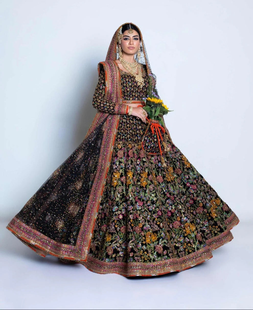 FahadHussayn presents a breathtaking black Lehnga Choli embellished with colorful different sized crystals. It is...