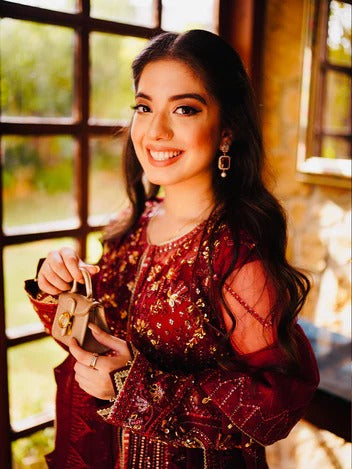 Introducing "Aqeeq" in a two-tone blend of brick and ruby red. This ensemble showcases a...