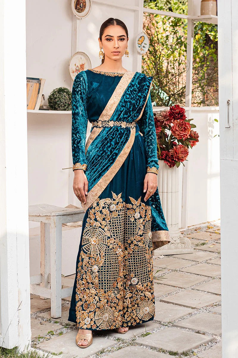 This beautiful teal green velvet blouse with embroidered neckline and sleeves is paired with golden...