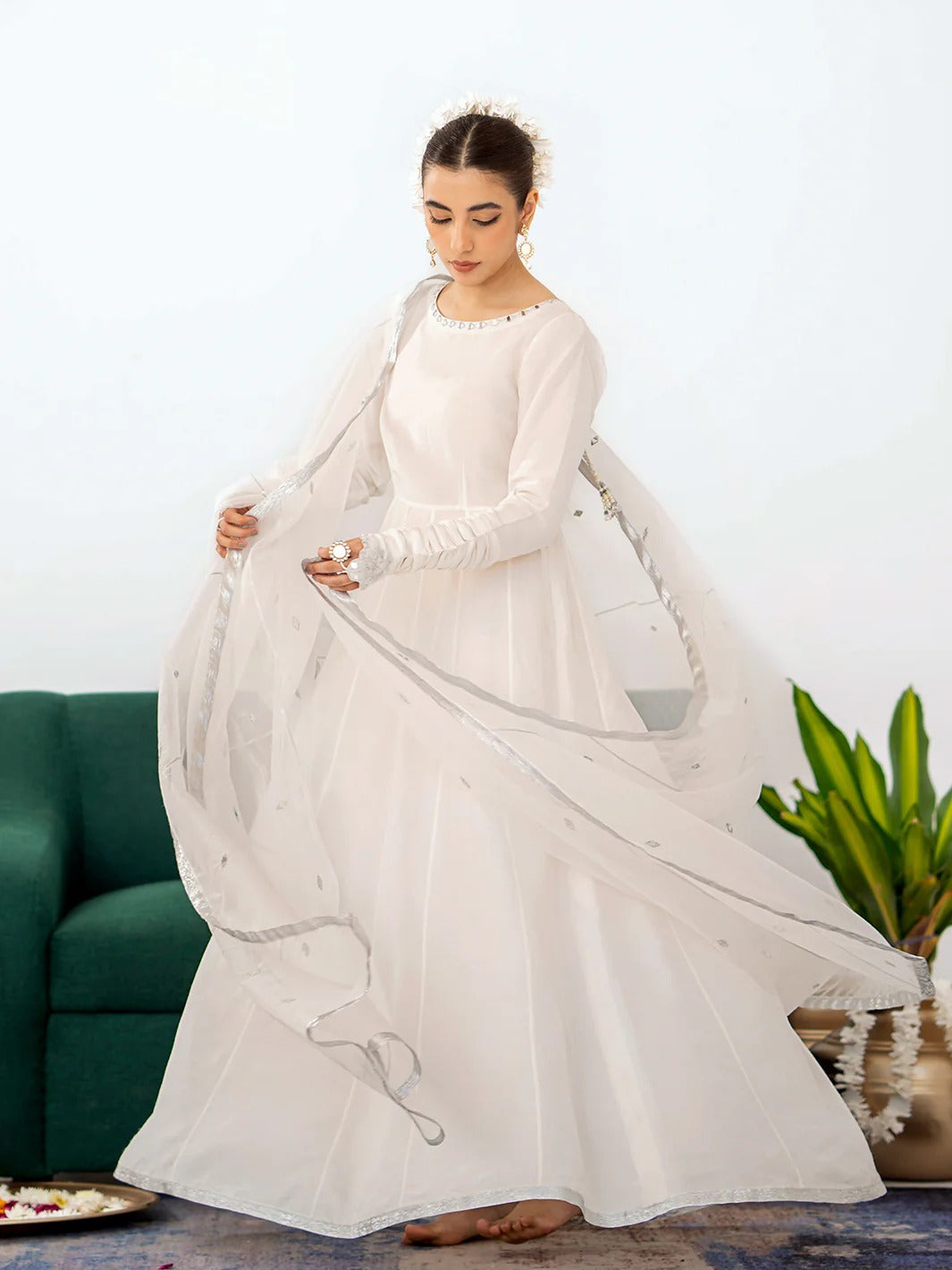 A pishwas crafted from Korean silk adorned with intricate mirror work on the neckline and...