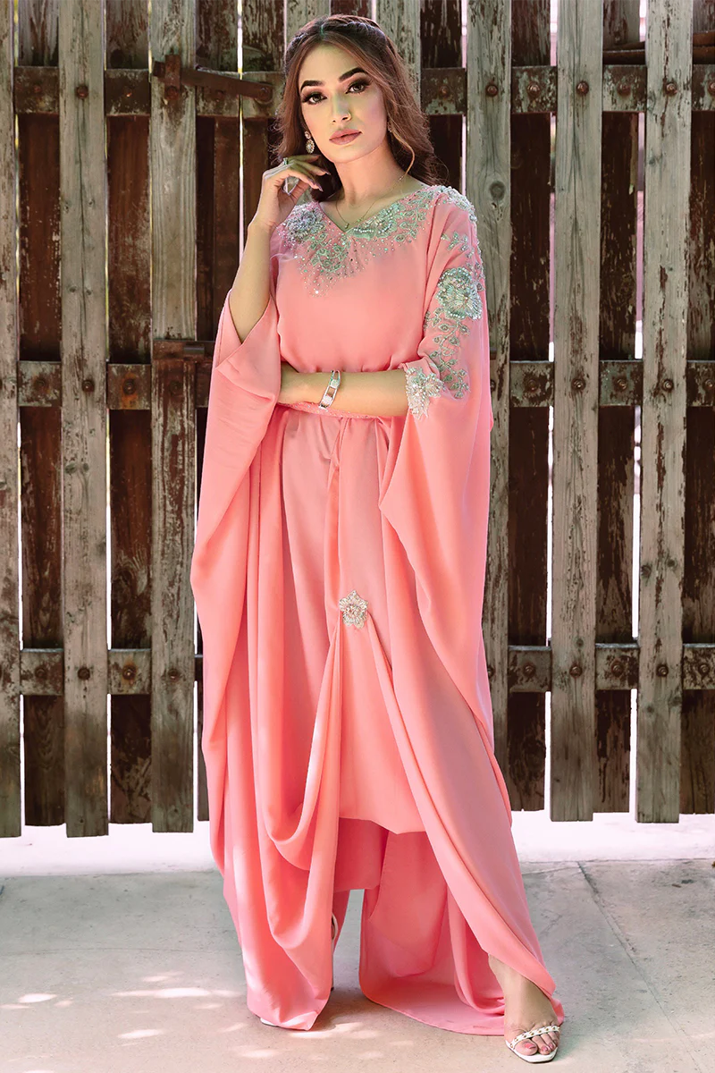 Full length embroidered belted kaftan with embroidered neckline and sleeves embellished with sequence and beads.