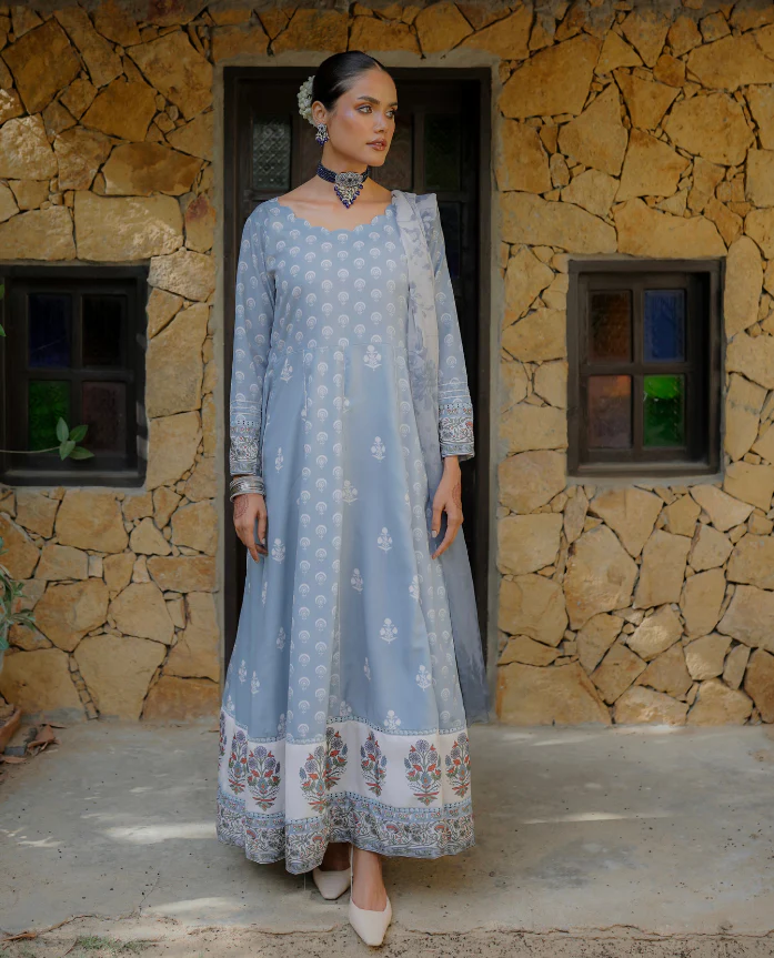 Gender: Women Category: Clothing Outfit Type: Eastern Ready to wear Sub-Category: Angrakha Bottom Style: Trouser Color Type: Aqua Dupatta Fabrics: Chiffon...