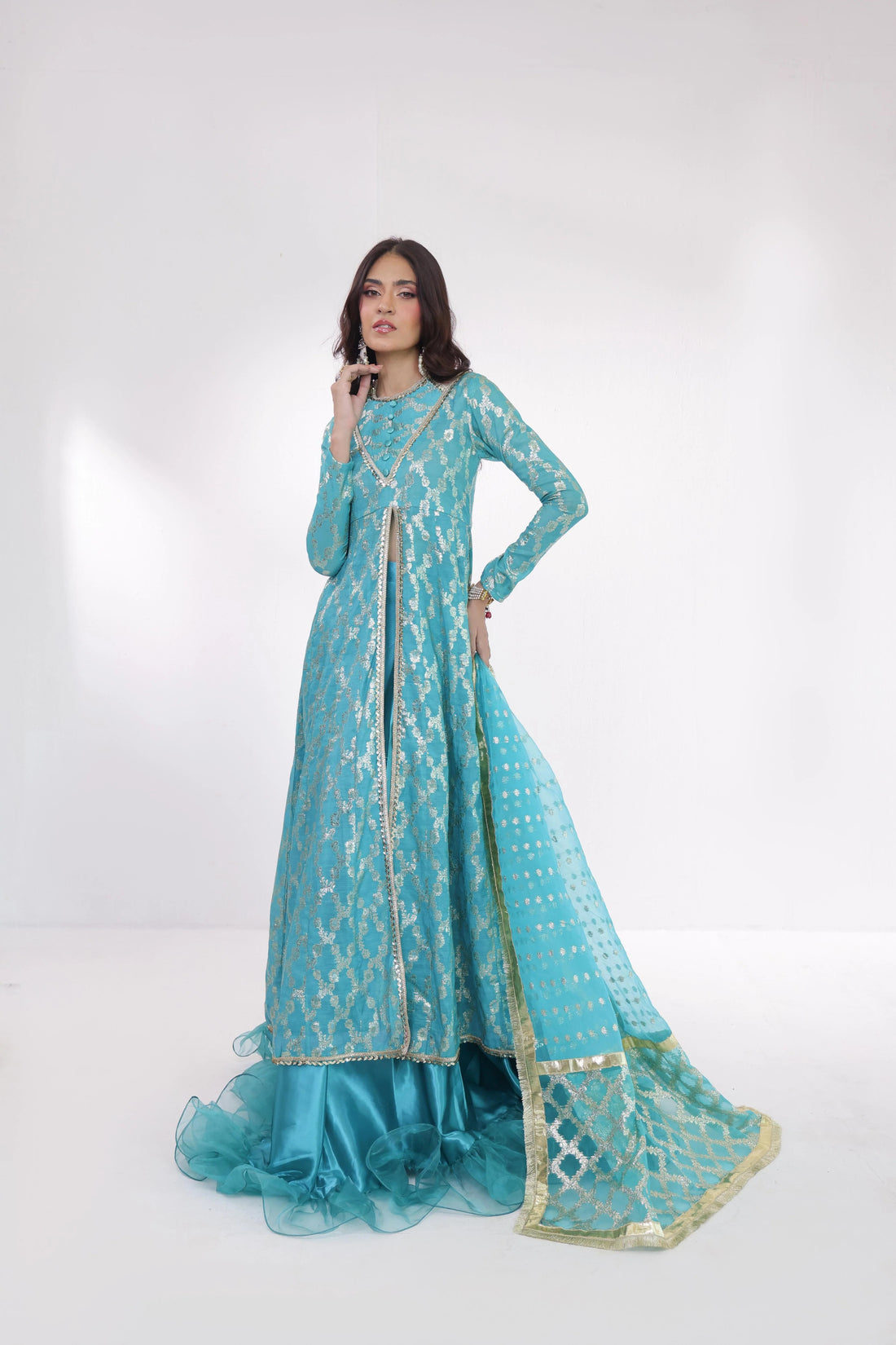 This luxurious 3-piece ice blue set features a stunning kalidaar pishwas, paired with a voluminous...