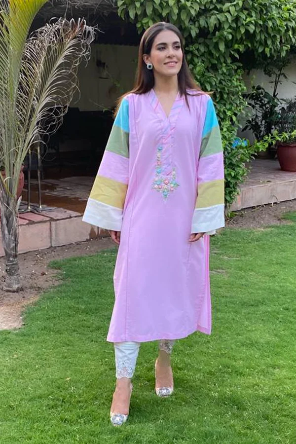 Cotton four kali Kurta with color blocked sleeves in pastel colors and embroidered neckline.