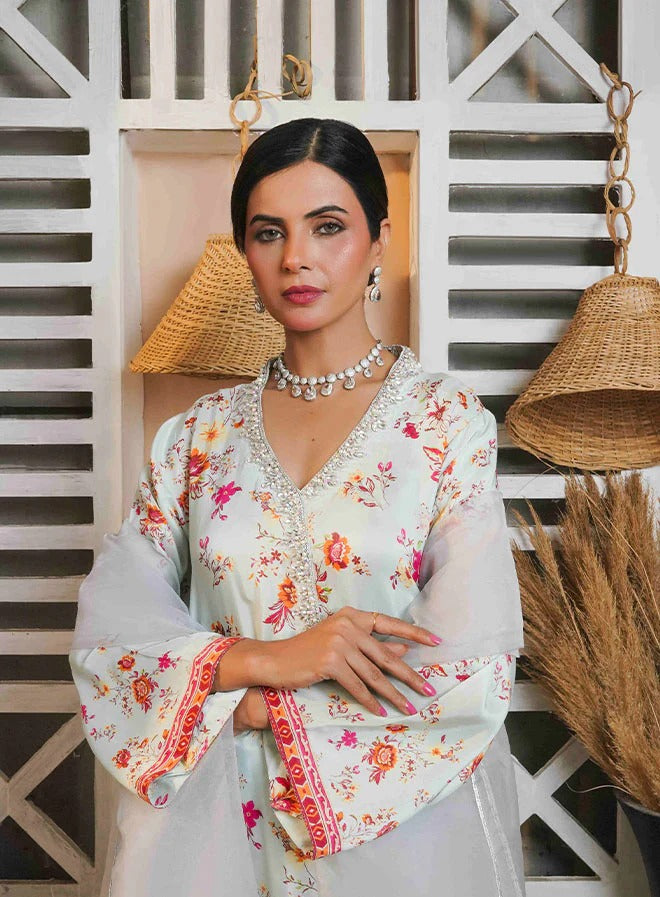 Presenting a must have collection filled with distinctive, quintessentially Kehkeshan prints, masterfully tailored to be cherished for years to come. This raw silk kurta shirt features a serene ice-blue canvas adorned with pastel-colored, artfully illustrated floral motifs. The neckline is delicately embellished with silver hand embroidery and stone detailing, adding a refined touch to the design. Paired with raw silk bottoms and a flowing organza dupatta, this ensemble exudes elegance and charm, making it perfect for any occasion. With a shirt length of 48 inches, it offers a graceful silhouette that blends timeless style with contemporary finesse.