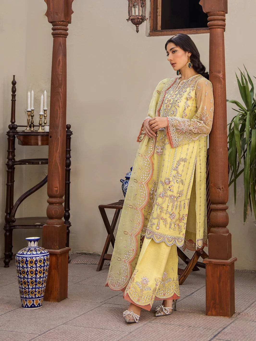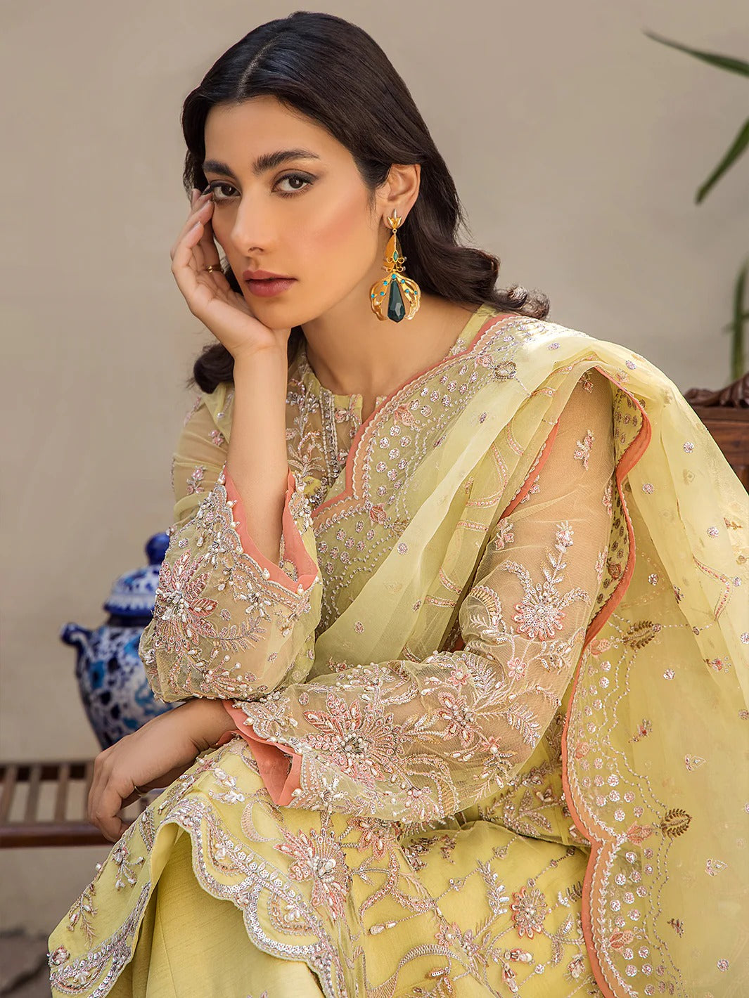 Featuring a versatile silhouette, crafted in chartreuse green on a pure net canvas. This artsy outfit features a playful symphony of blooming floral embroideries in subtle shade of peach pink and yellow. The work of art embroidered organza dupatta is laden with sequins further enhanced with an additional layer of soft pink scalloped border. This ethereal look is paired with silk embroidered pants with similar scalloped border with added soft pink patti.