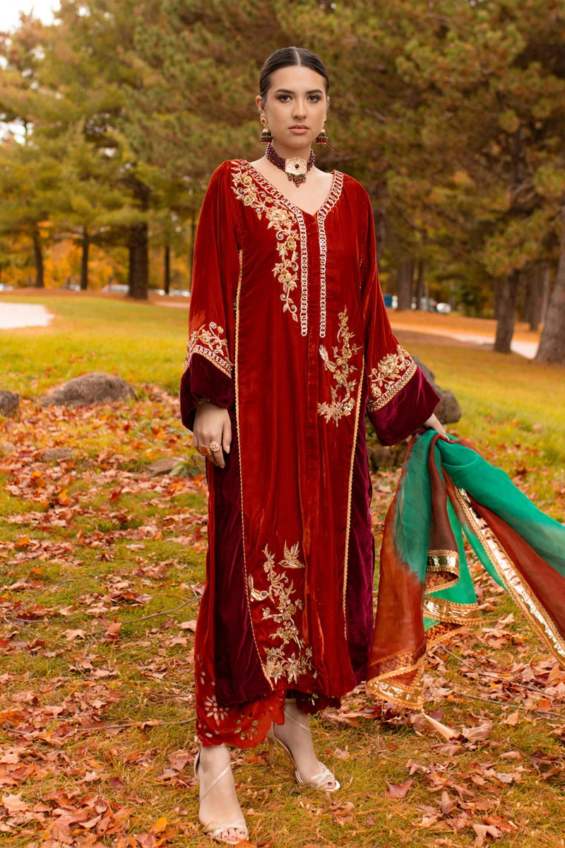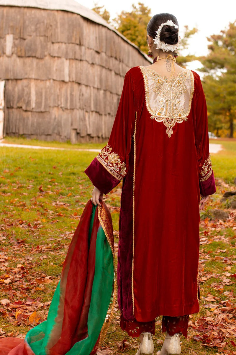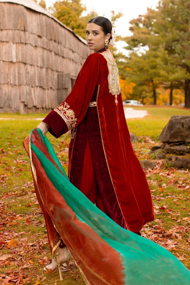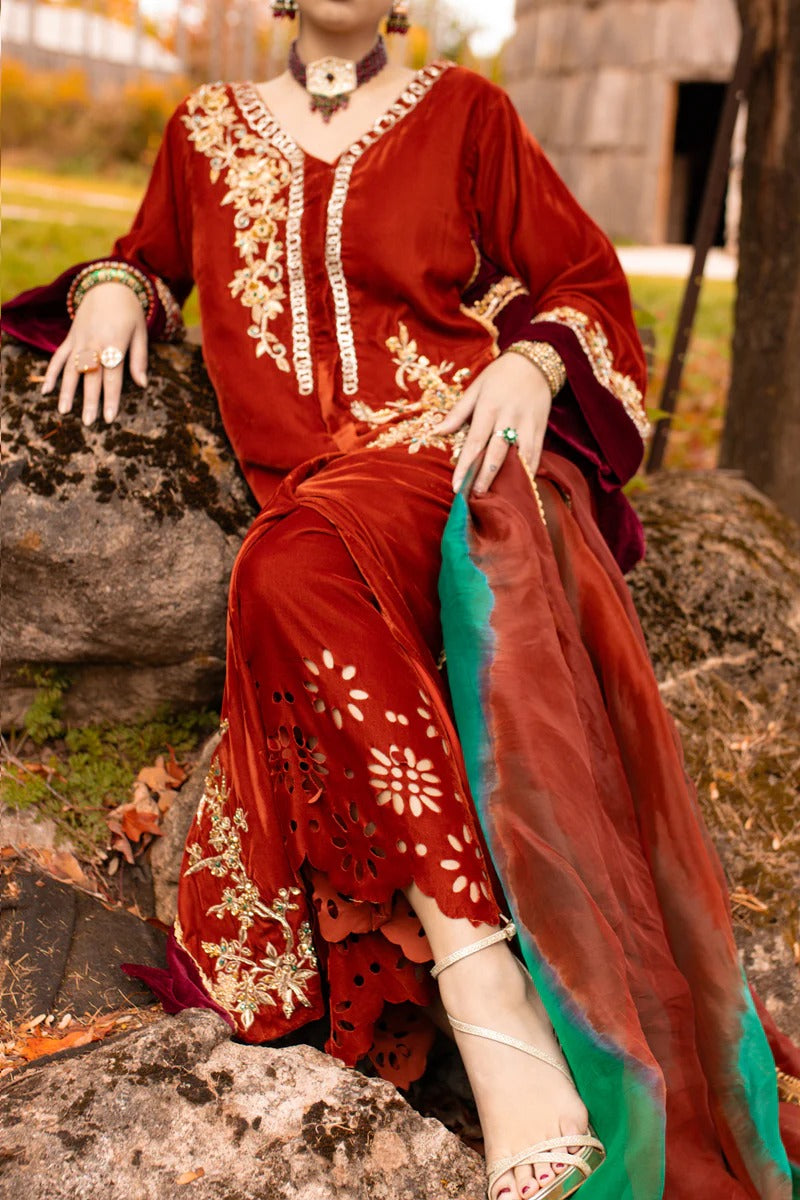 Introducing "Aqeeq" in a two-tone blend of brick and ruby red. This ensemble showcases a long, four-kali front-open kurta paired with laser-cut culottes, creating a stunning contrast. The two-tone velvet shirt features intricate ari work on the front open kurta, adorned with emeralds, champagne beads, and sequins, adding a touch of regal opulence. This exquisite outfit is a perfect choice for special occasions.