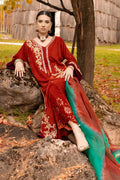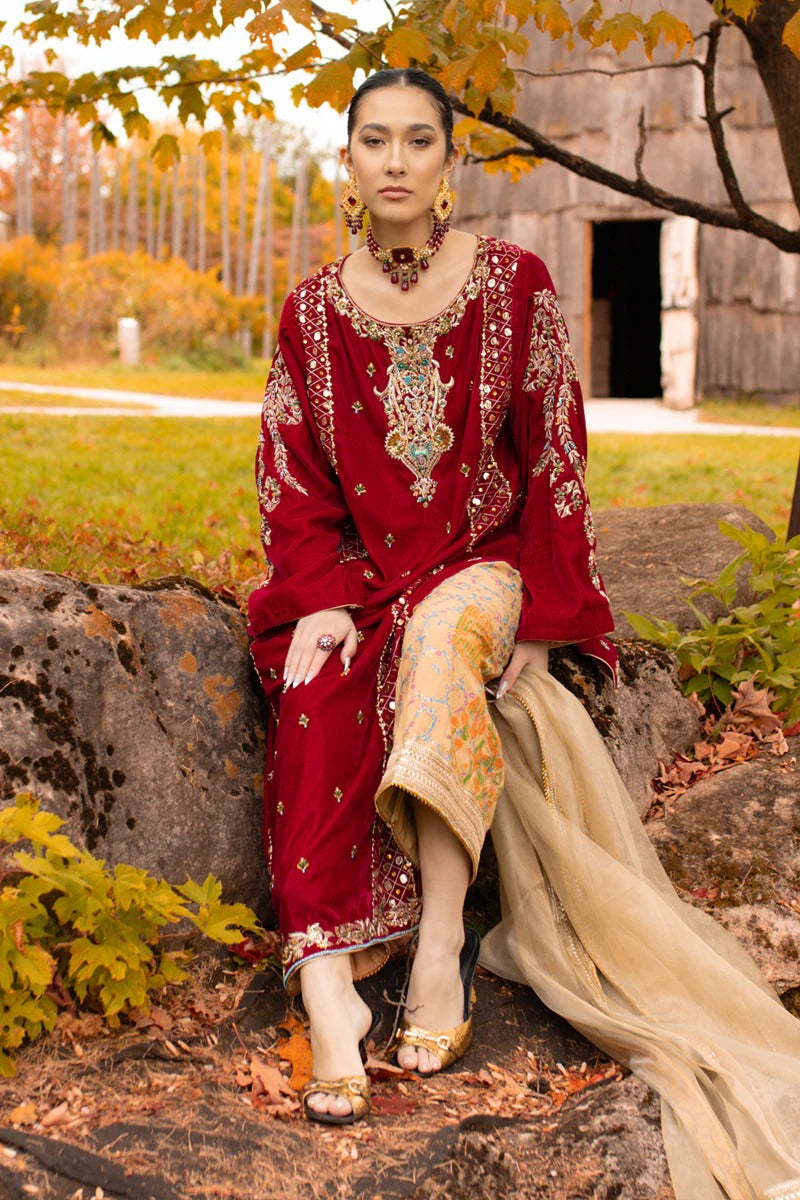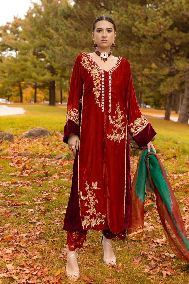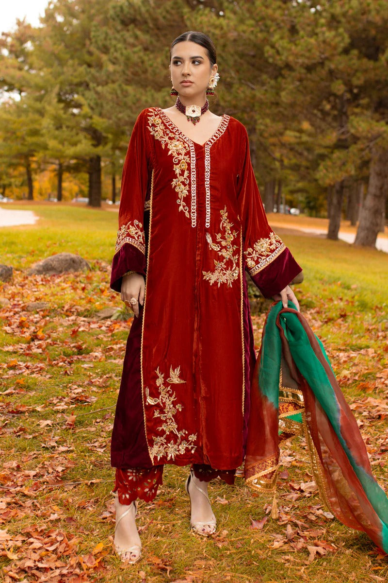 Introducing "Aqeeq" in a two-tone blend of brick and ruby red. This ensemble showcases a long, four-kali front-open kurta paired with laser-cut culottes, creating a stunning contrast. The two-tone velvet shirt features intricate ari work on the front open kurta, adorned with emeralds, champagne beads, and sequins, adding a touch of regal opulence. This exquisite outfit is a perfect choice for special occasions.