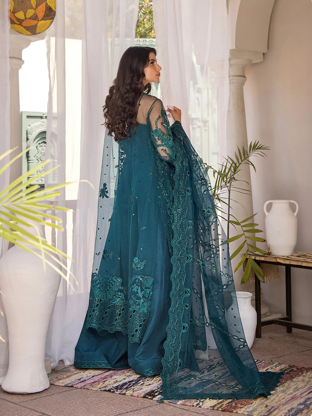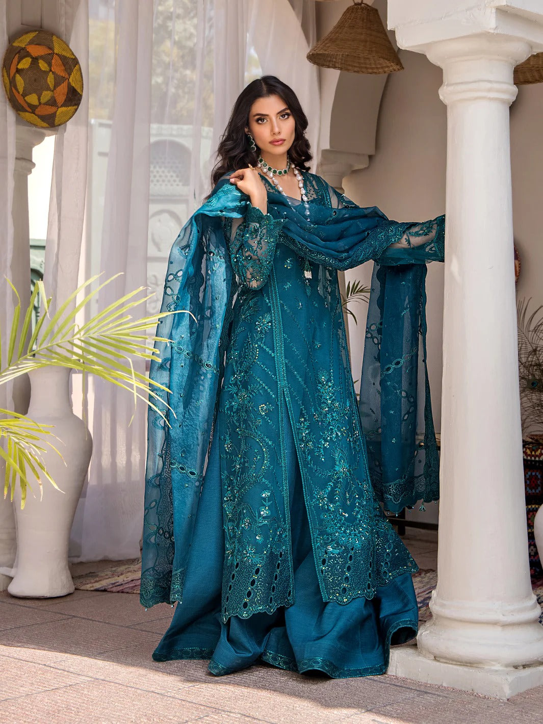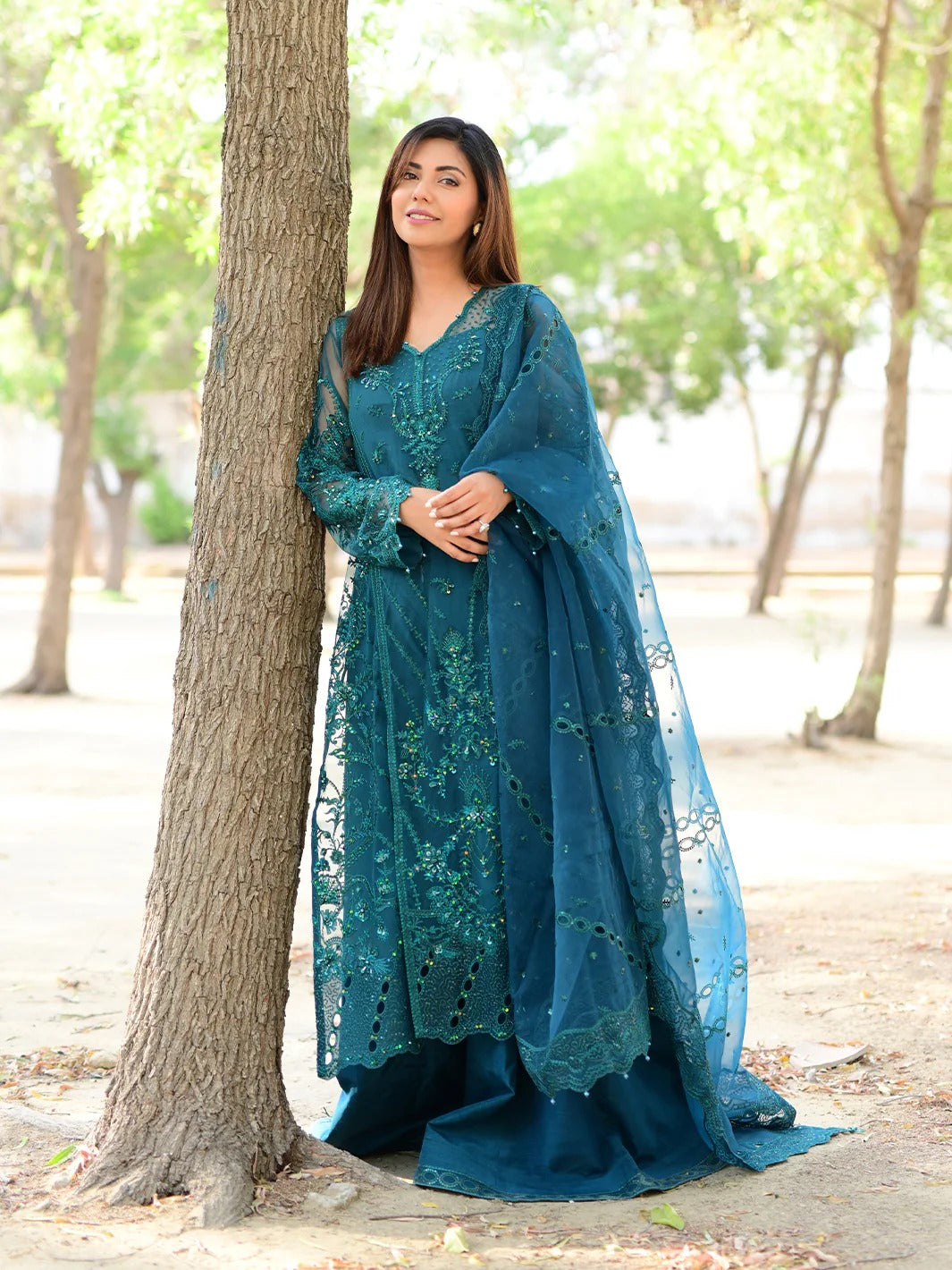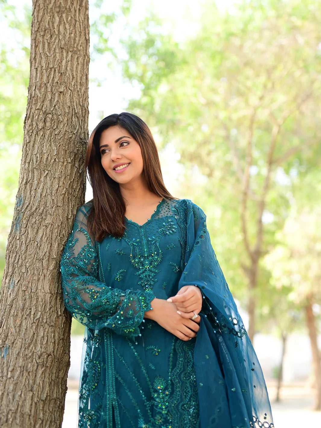 Crafted on ethereal net canvas, this straight paneled shirt is a perfect fit for this festive season. The embroidered front is enhanced with hand embellishments. The sleeves and hem features scallop and cut work details making the entire look stand out from the rest. This look is paired with embroidered dupatta and flared sharara pants.