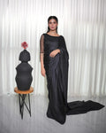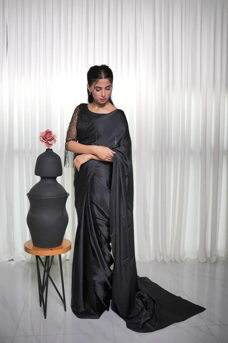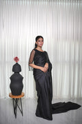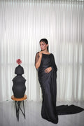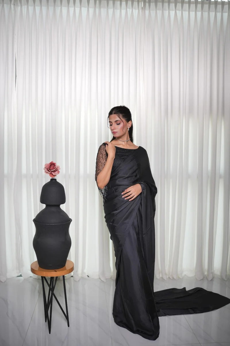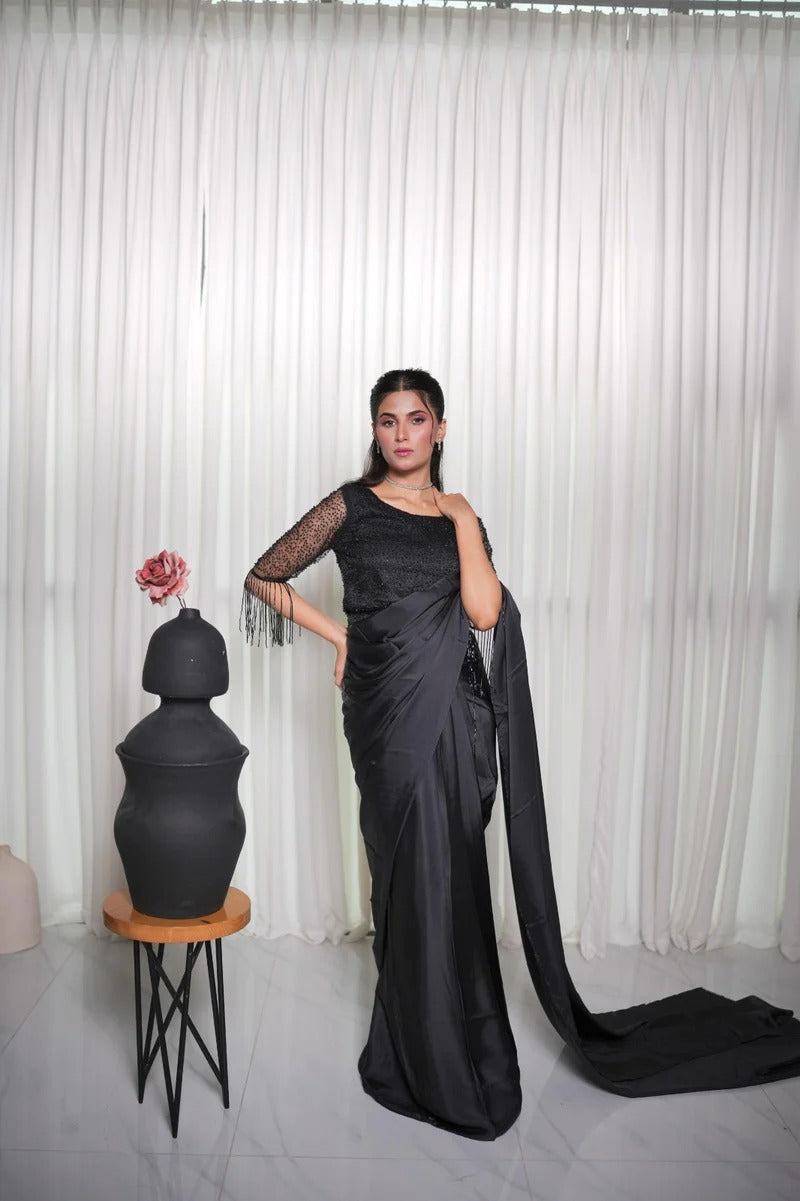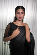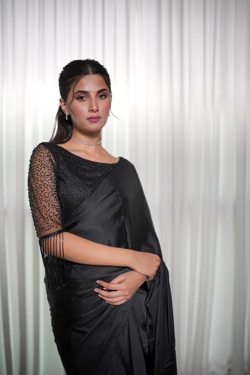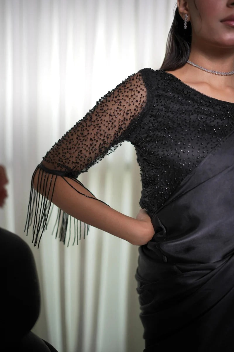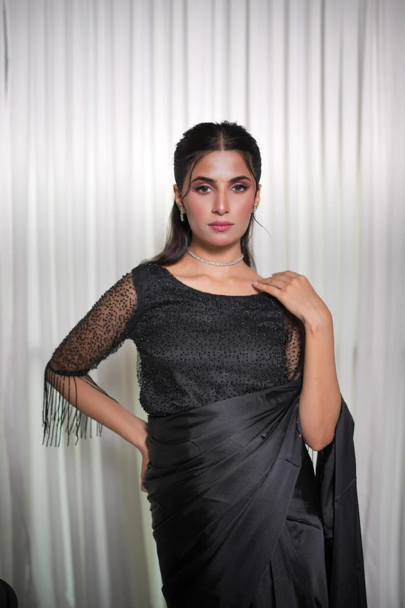This beautiful black silk saree is paired with a cutdana-embellished blouse and stylish hanging embellishments on the sleeves, adding a modern and elegant touch to the ensemble. Perfect for making a statement at any special occasion.