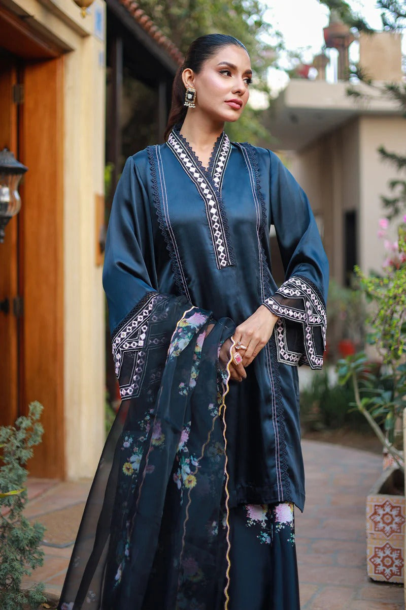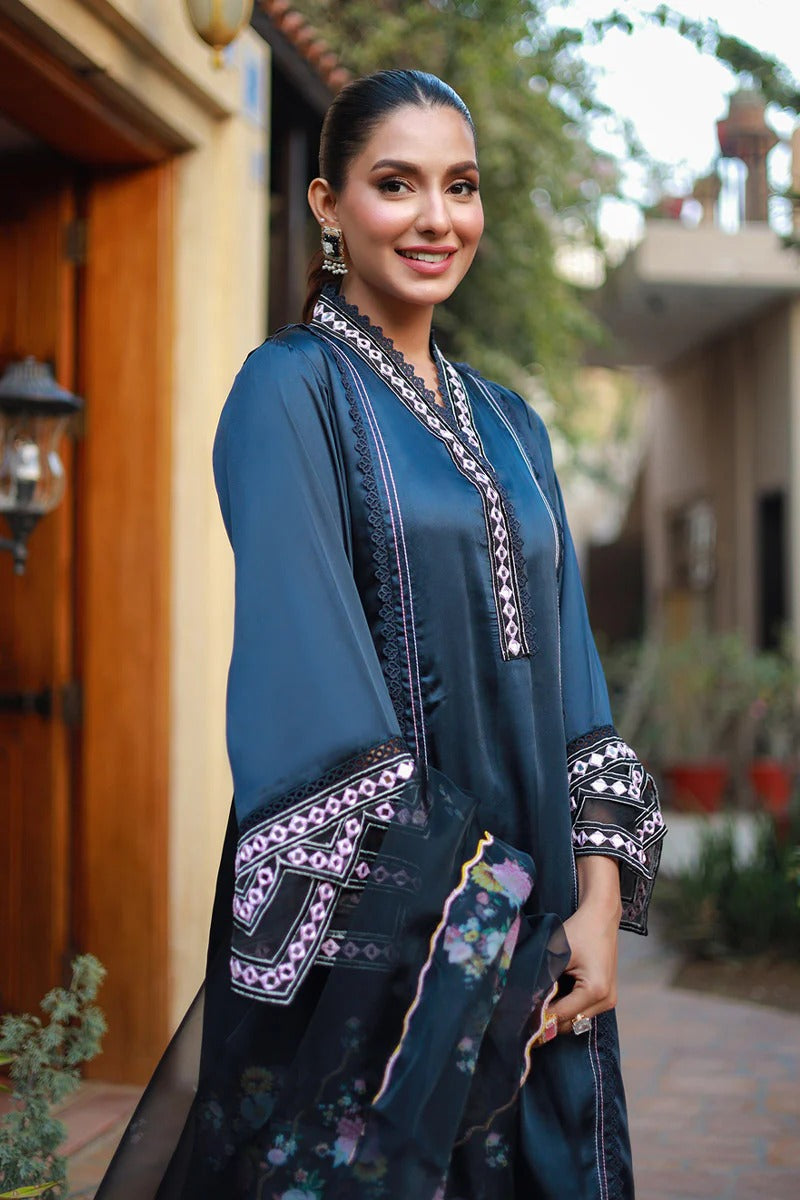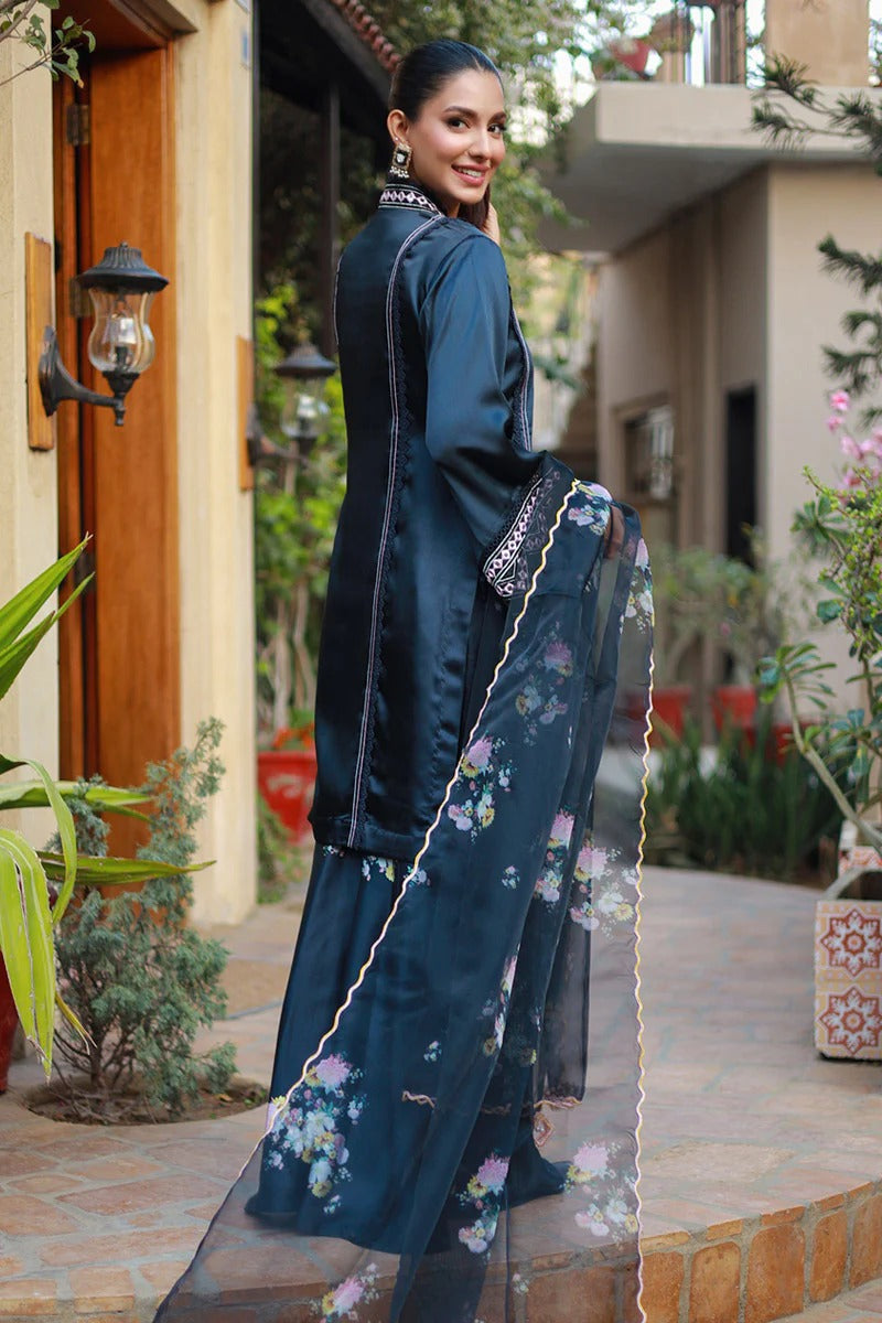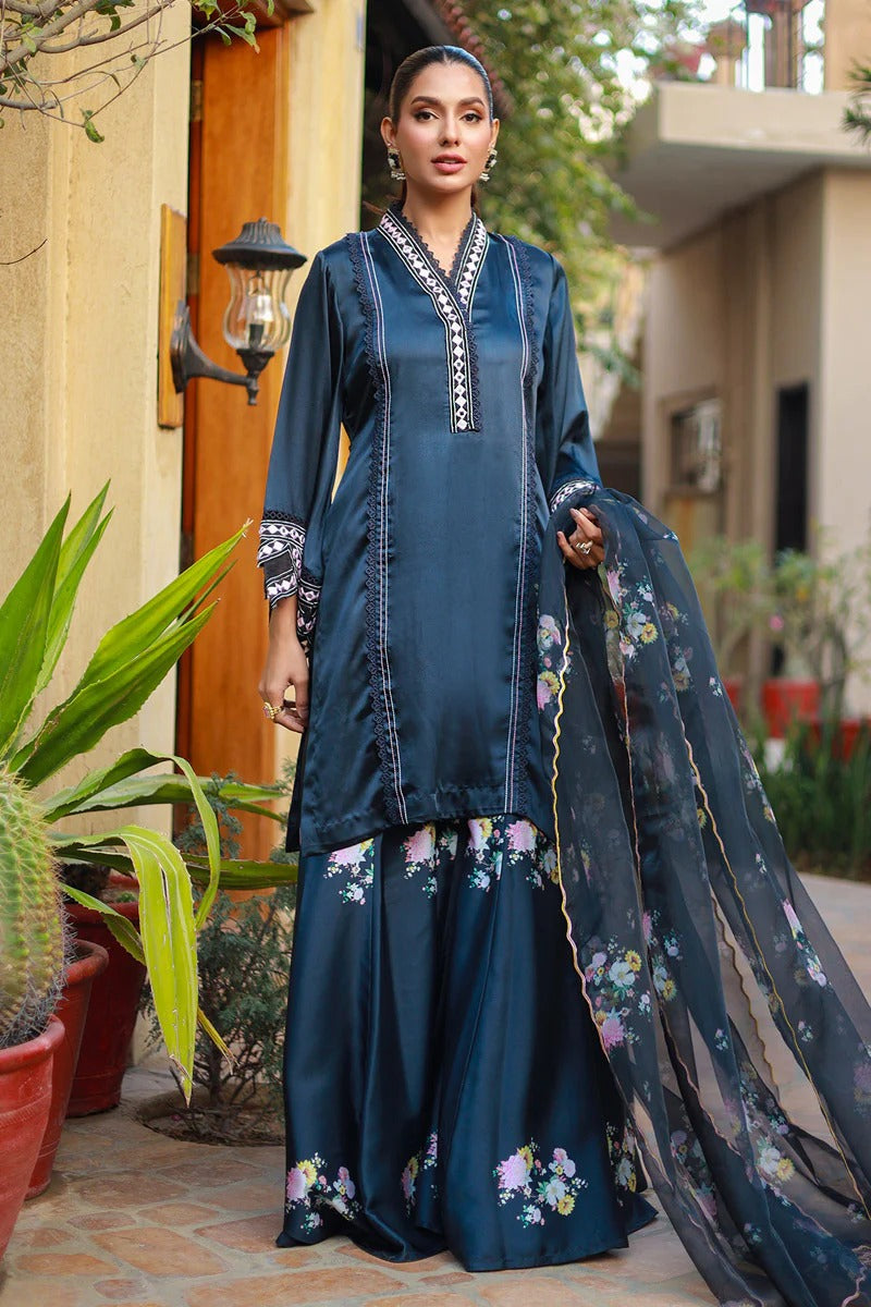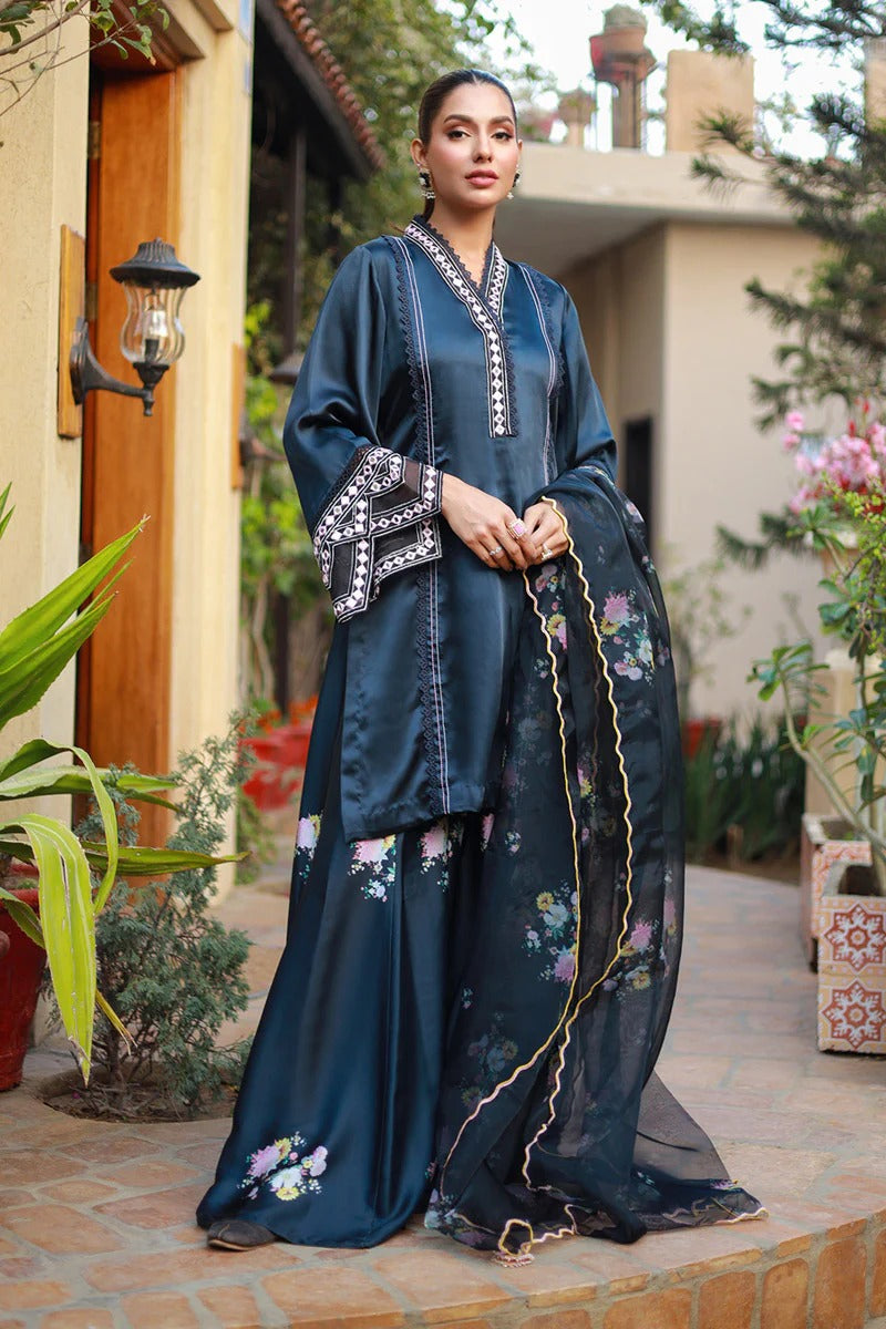 This brief silhouette is crafted from luxurious silk canvas, showcasing anchor thread stitches and lace manipulation on the shirt to evoke a relaxed, casual aesthetic. The sleeves are adorned with beautiful resham and mirror embroidery, adding an elegant touch. The ensemble includes floral-printed kalidar flared pants that enhance its charm. Completing the look is an organza dupatta, enhanced with embellished details, perfect for casual outings and gatherings.