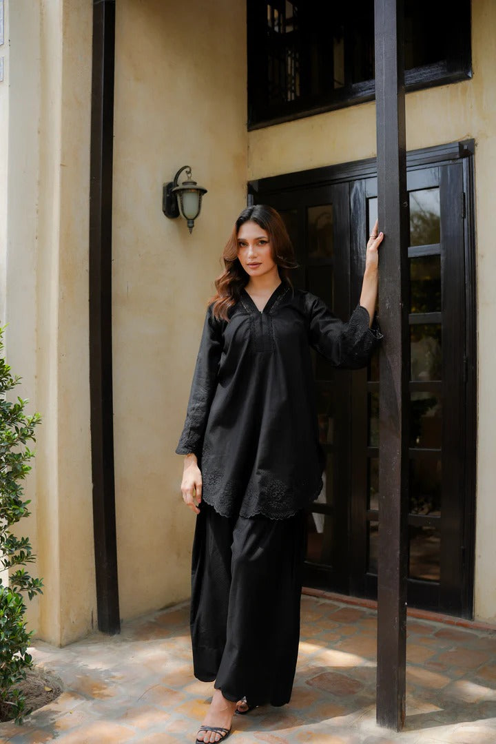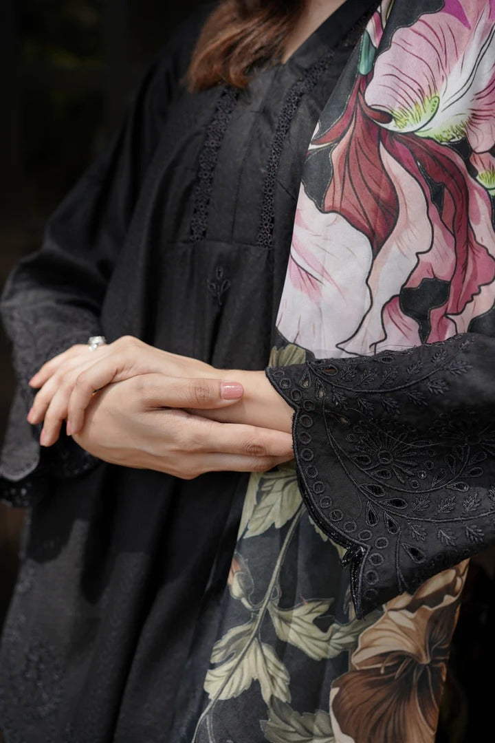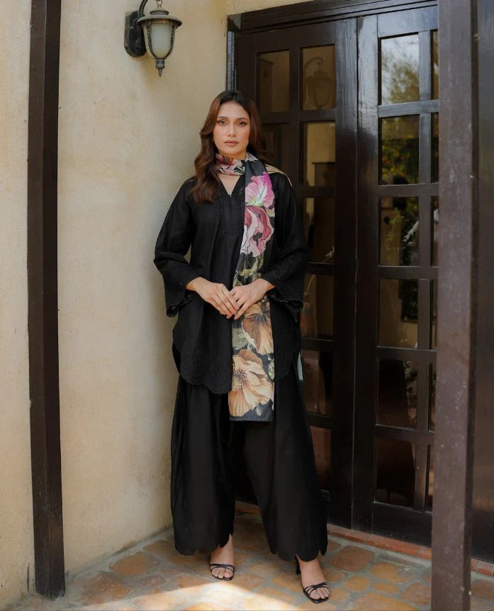 A graceful blend of tradition and style, this set features elegant cutwork and detailed embroidery on the sleeves, trouser, and neckline. It’s beautifully paired with a printed silk dupatta. - Fabric: WASH & WEAR