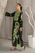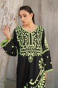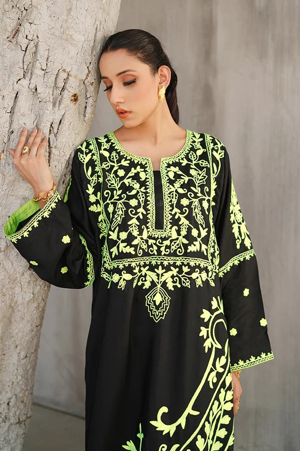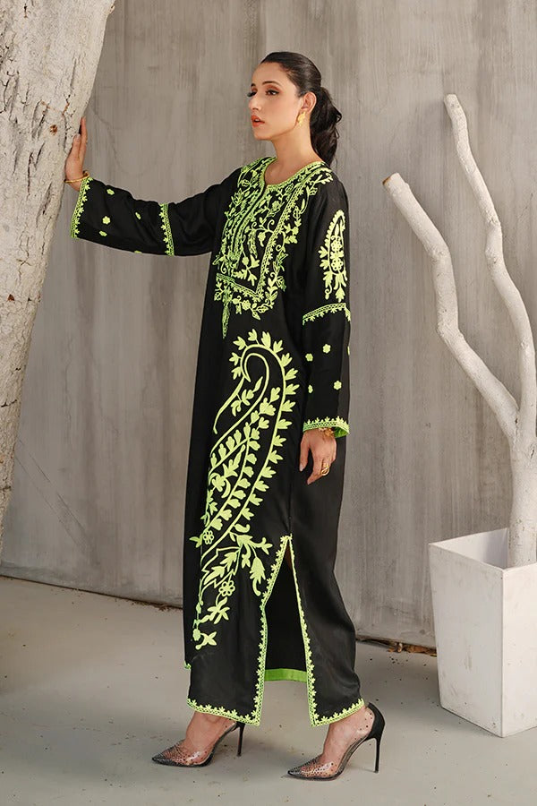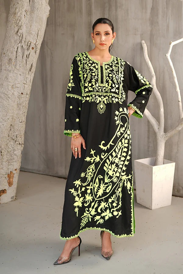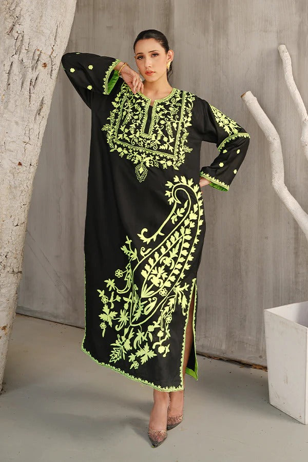 This striking ensemble showcases a full-length kaftan, a timeless silhouette known for its flowing elegance and effortless charm. Crafted from soft and breathable cotton silk, the kaftan offers a perfect balance of comfort and luxury. The fabric’s natural sheen adds a subtle richness, making the outfit suitable for both casual sophistication and formal wear. The kaftan is rendered in classic black, serving as a bold and versatile base that highlights the detailed embroidery beautifully. Adorning the entire surface are intricate embroidered motifs, thoughtfully spread across the front, back, and sleeves. These embellishments feature paisley patterns—a traditional motif with Persian origins, often associated with timeless grace and cultural heritage. The paisleys are finely detailed, possibly stitched using tonal or contrasting threads to create depth and texture. The embroidery may be highlighted with subtle hints of metallic threadwork, lending a delicate glint to the overall look without overpowering its minimal sophistication. The loose, floor-length cut of the kaftan drapes fluidly over the body, allowing for graceful movement and a universally flattering fit. Its relaxed structure is often cinched slightly at the waist or left completely free, depending on the desired look—whether flowy and bohemian or more structured and formal. This black paisley kaftan is a perfect statement piece for festive gatherings, evening dinners, or cultural occasions, offering a fusion of traditional artistry and modern elegance wrapped in comfort.