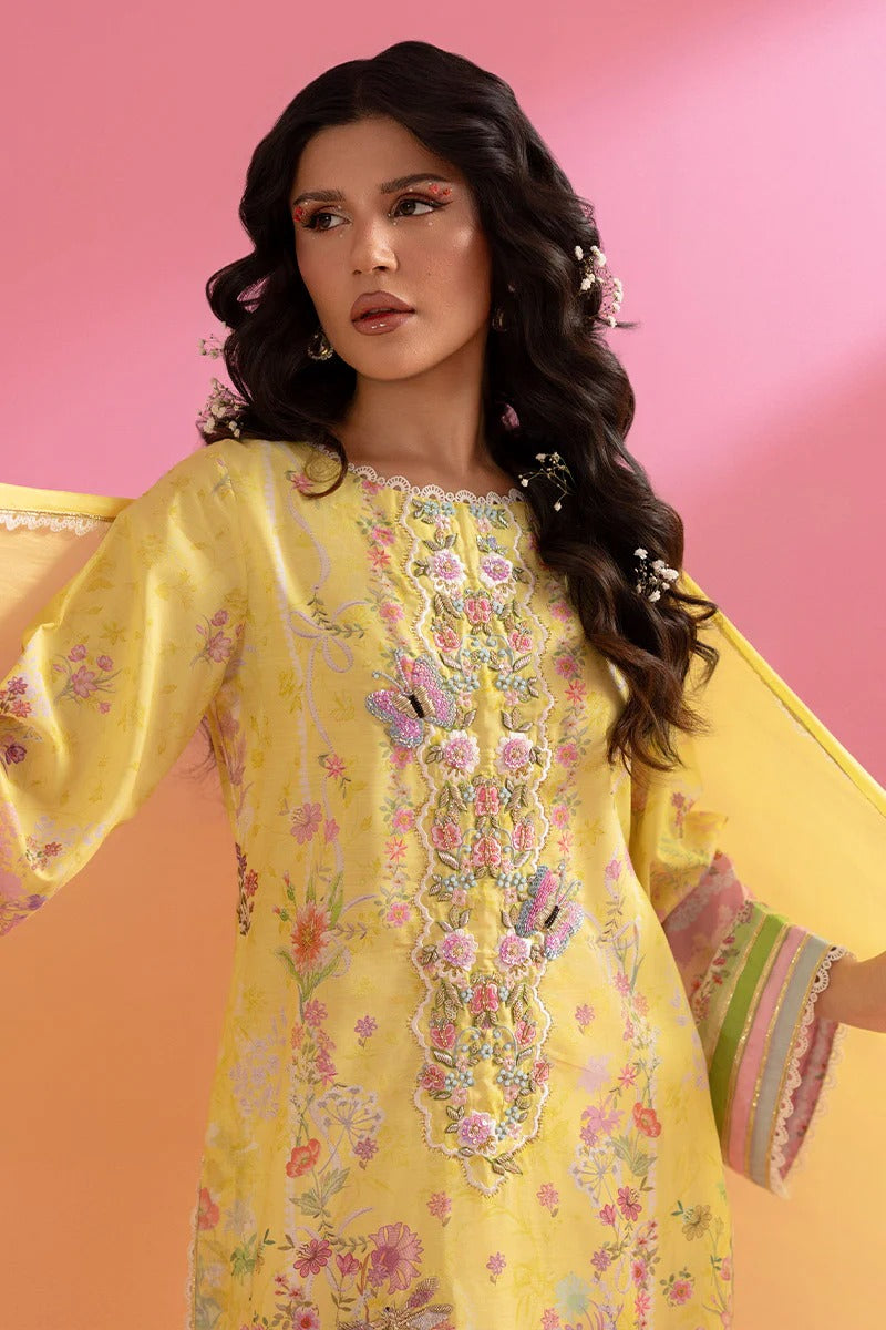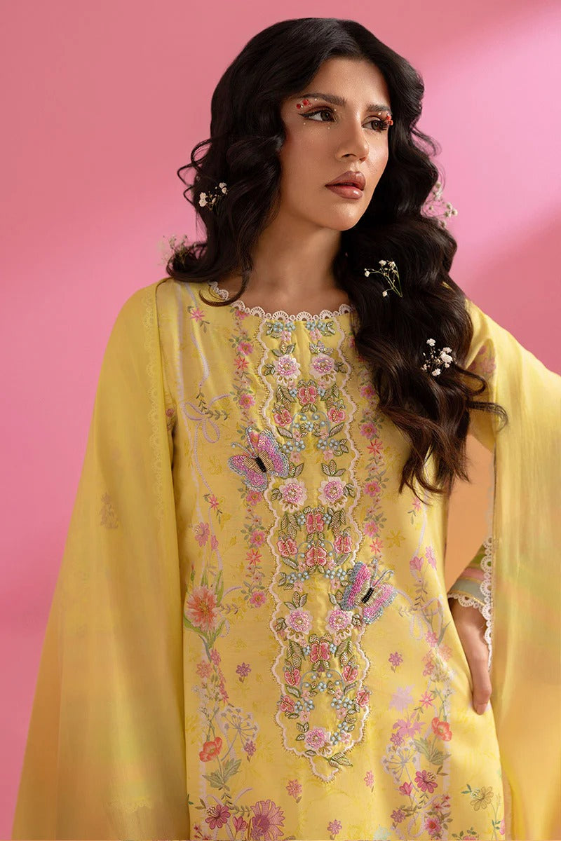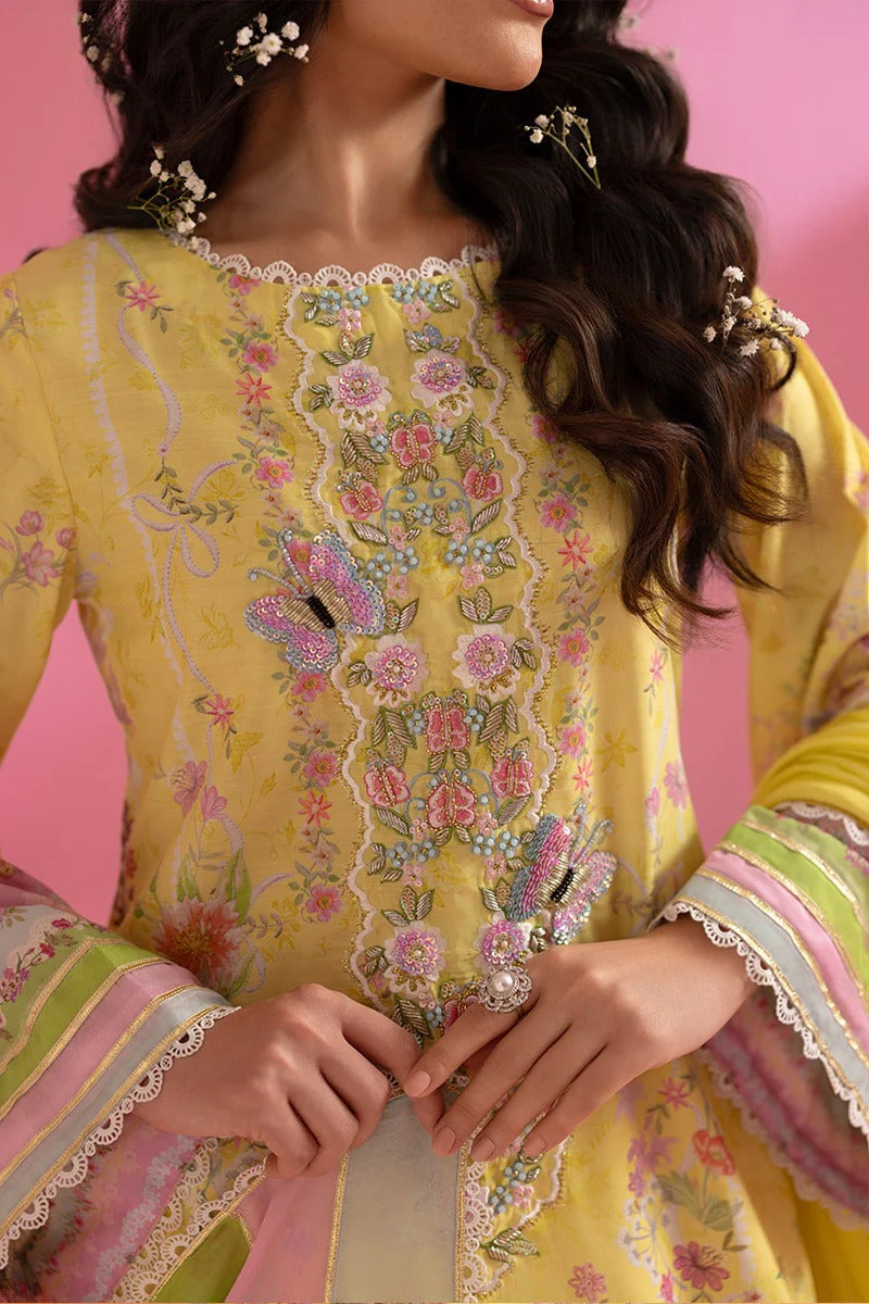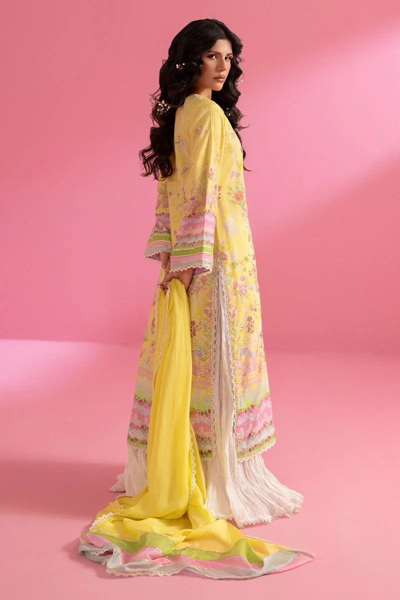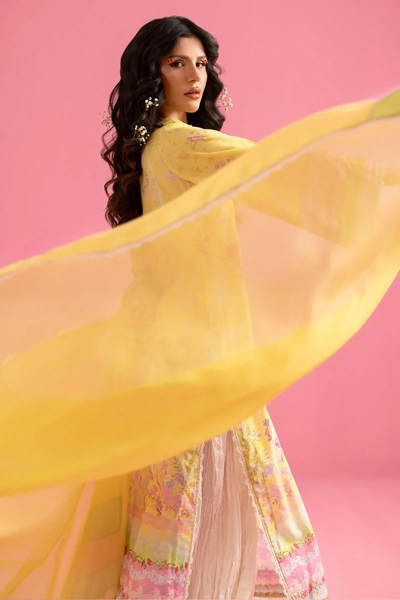 Introducing Bulbine a graceful ensemble in a soft light yellow hue, crafted from luxurious raw silk and adorned with delicate hand embellishments, intricate laces, and gota detailing on the sleeves and dupatta. The long silhouette flows with effortless elegance, making it a radiant Mayun or Mehndi outfit for daytime festivities.
