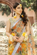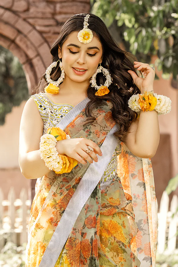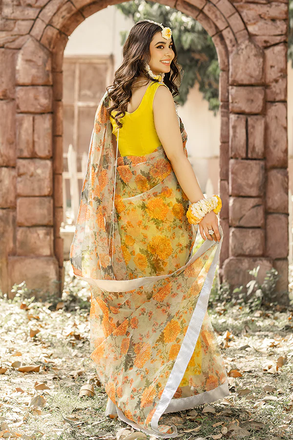Keeping in the mind, the exclusive seasonal trends, Chambeli is a colorfully floral draped saree on the base of organza and pure silk blouse crafted masterfully with mirror and gota embellishments stitched on the canvas of yellow hue making it a wholesome treat for your forthcoming festivities.