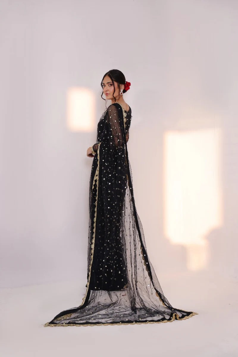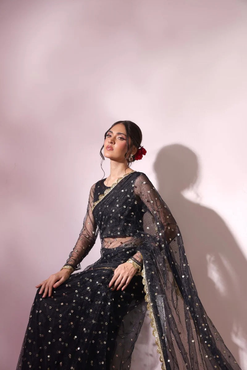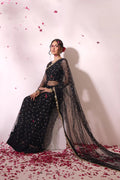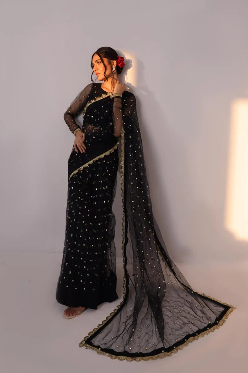 A stunning black embroidered saree crafted from delicate net fabric. It features intricate embroidery work with shimmering accents and is bordered with an elegant scalloped lace on all four sides. The blouse is also made from net fabric, complementing the saree beautifully, making it a perfect choice for formal or festive occasions.