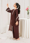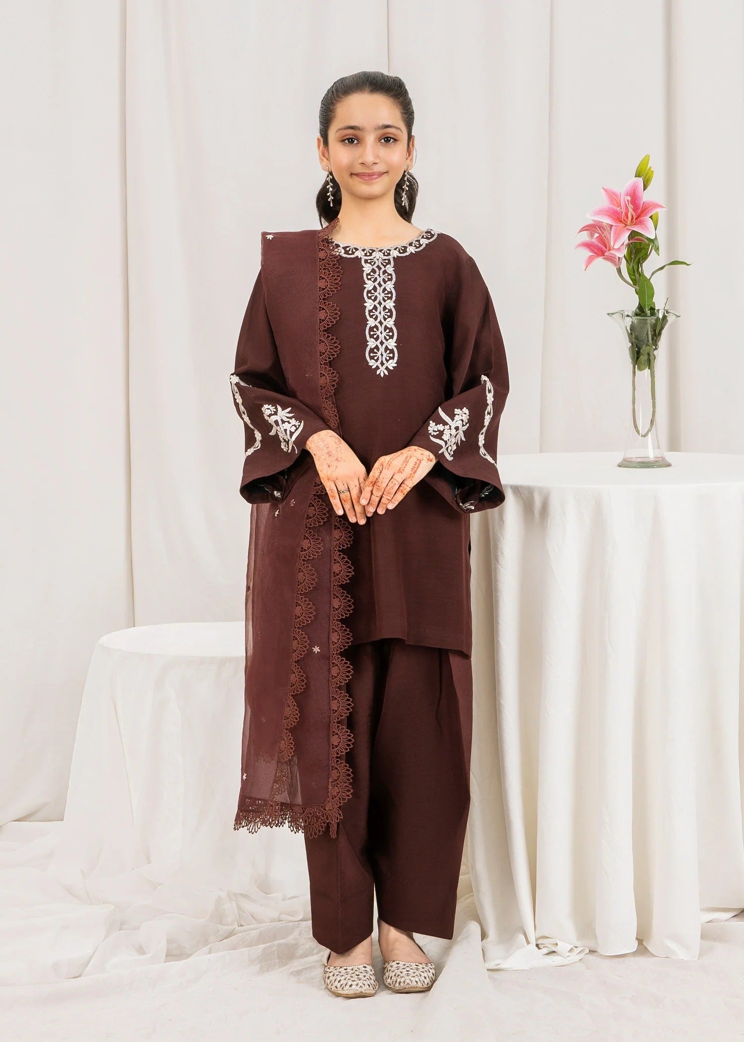 This 3 piece brown embroidered silk dress for kids with an organza dupatta is the epitome of timeless elegance. The deep brown silk shirt is beautifully adorned with intricate embroidery, adding richness and texture to the ensemble. Paired with matching silk trousers for a seamless silhouette, the outfit is completed with a delicate organza dupatta that brings a touch of lightness and sophistication. The contrast between the lustrous silk and airy organza creates a perfect balance, making this outfit ideal for festive occasions, formal events, or evening gatherings. Classic yet contemporary, it’s a graceful choice for any refined wardrobe.