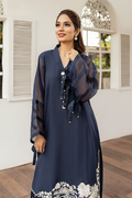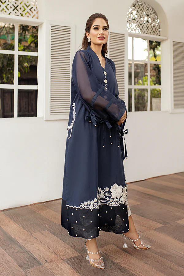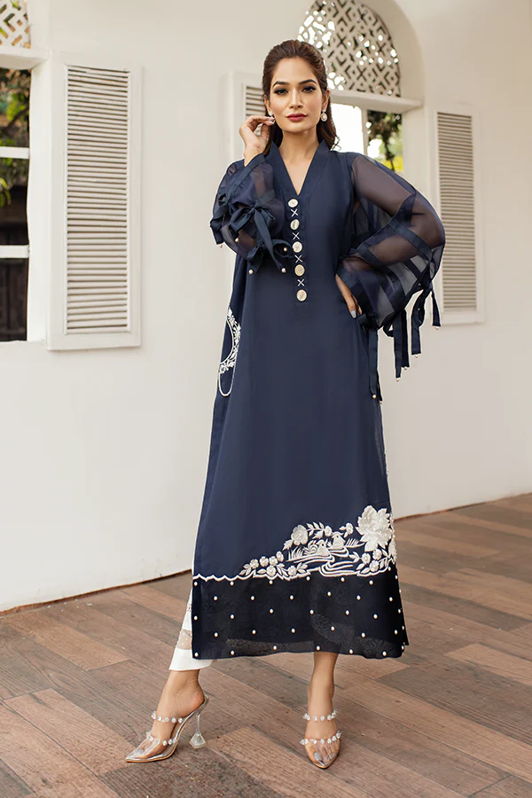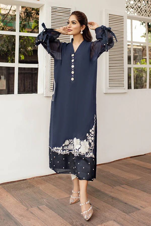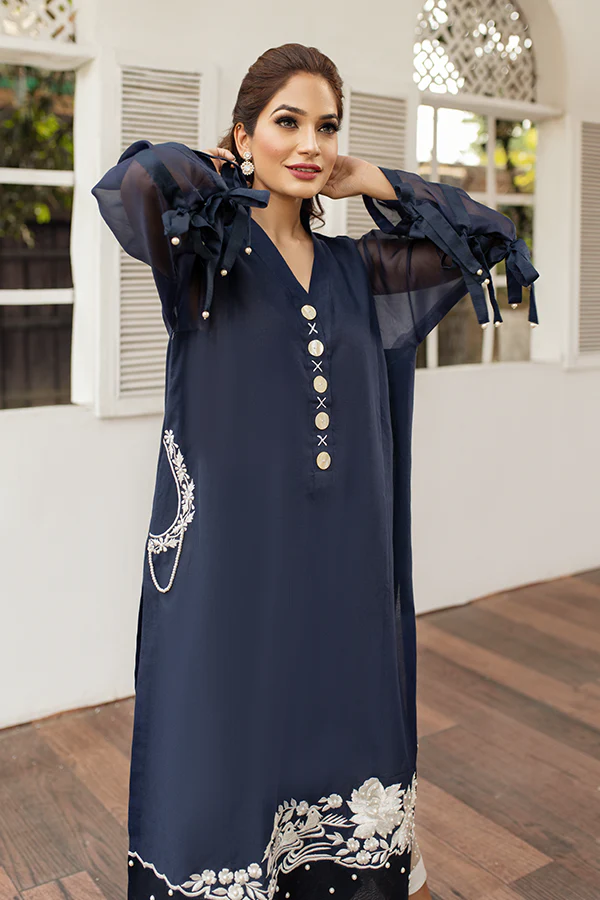Elana is an effortlessly magical cotton-based navy blue shirt intricately embellished with pearls and detailed organza work on the hemline and sleeves. Paired with it is a matching cotton Khari style shalwar finished with an organza and pearl details radiating a complimenting glow to your seasonal outlook.
