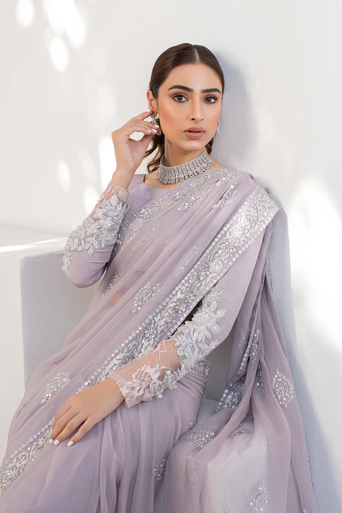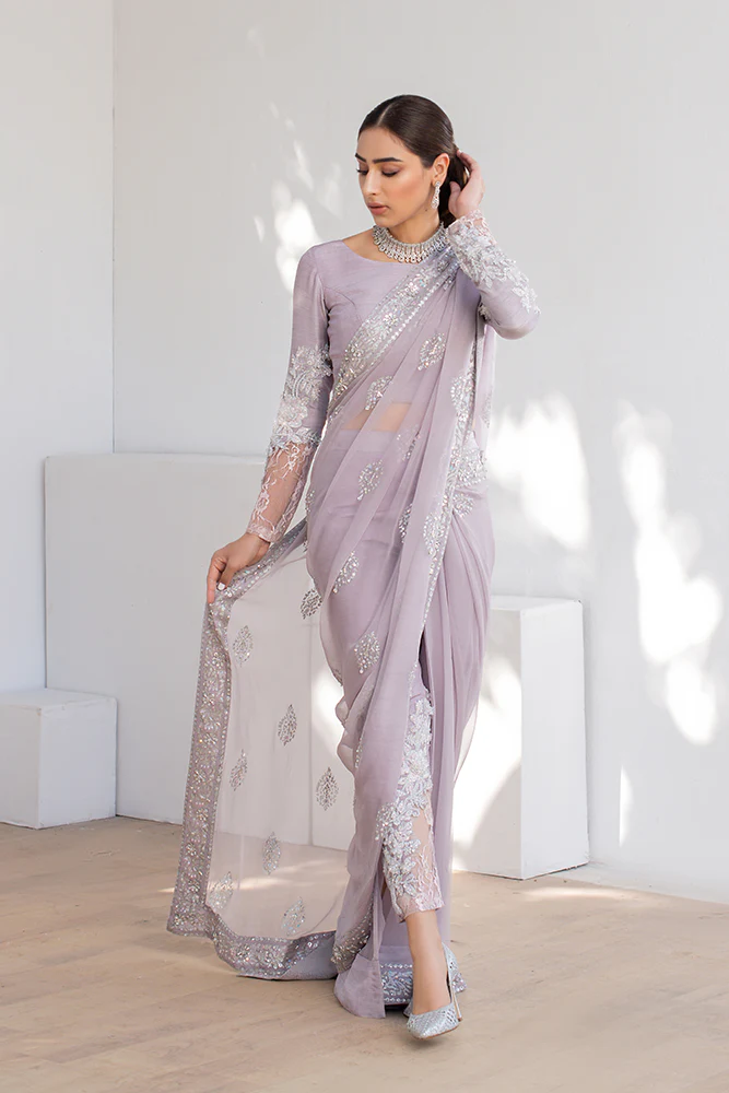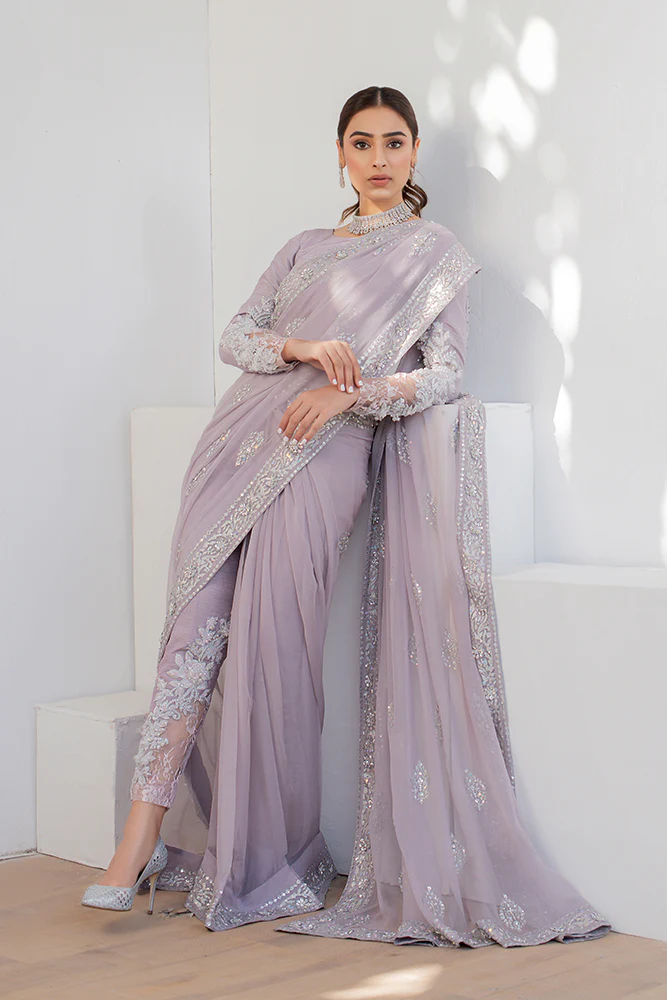 This searing mauve saree pants ensemble is crafted from the purest Chiffon. The illustrious of Saree are adorned with beautiful hand embellishments of Sequence beadwork using finest zari lace. Finishing the look, paper raw silk pants with gorgeous ornaments are paired making this outfit the perfect choice for any event!