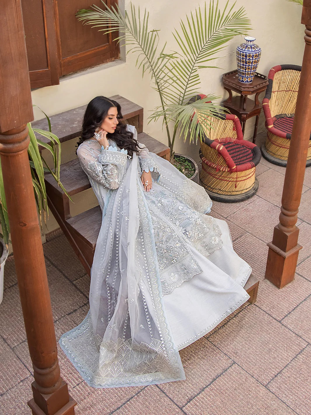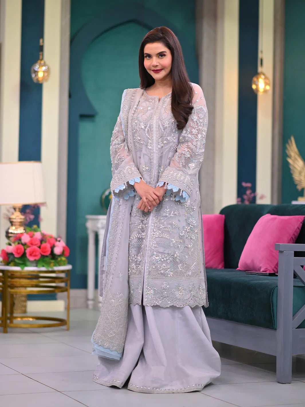 Crafted on ethereal net base this exquisite ensemble in a dreamy grey color palette is curated with intricate threadwork and sequins enhanced with hand embellishment all over. Completing the look with embroidered organza dupatta, finished with scalloped embroidered borders with an additional layer blue organza. The silk sharara pants are also enriched with embroidered border, making it a marvelous look for any occasion this season.