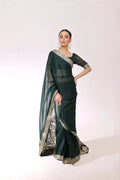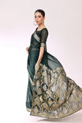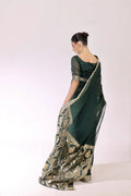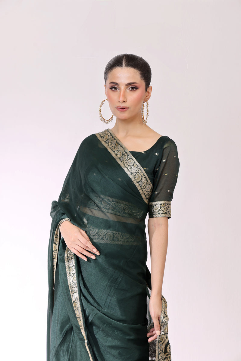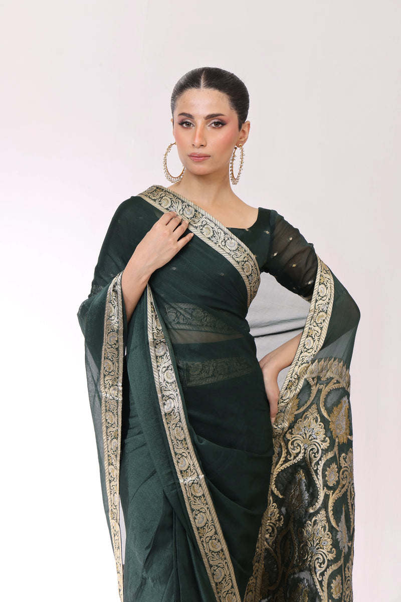 This green and gold Bamber Chiffon saree is a classic choice for any occasion. The woven gold border adds a refined touch, while the Banarasi brocade pallu highlights fine craftsmanship.