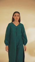 Crafted from luxurious Raw Silk, the shirt boasts a front cutline and is adorned with meticulously handcrafted buttons on the front, adding a touch of elegance and uniqueness. The sleeves are a work of art with bold embroidery and cut work details, featuring gathers and cuff sleeves that create an aura of sophistication. The outfit is paired with a Korean Raw Silk narrow trouser featuring embroidered border, ensuring both comfort and contemporary style.