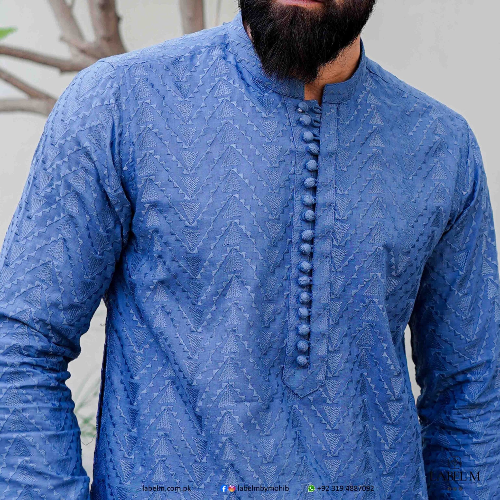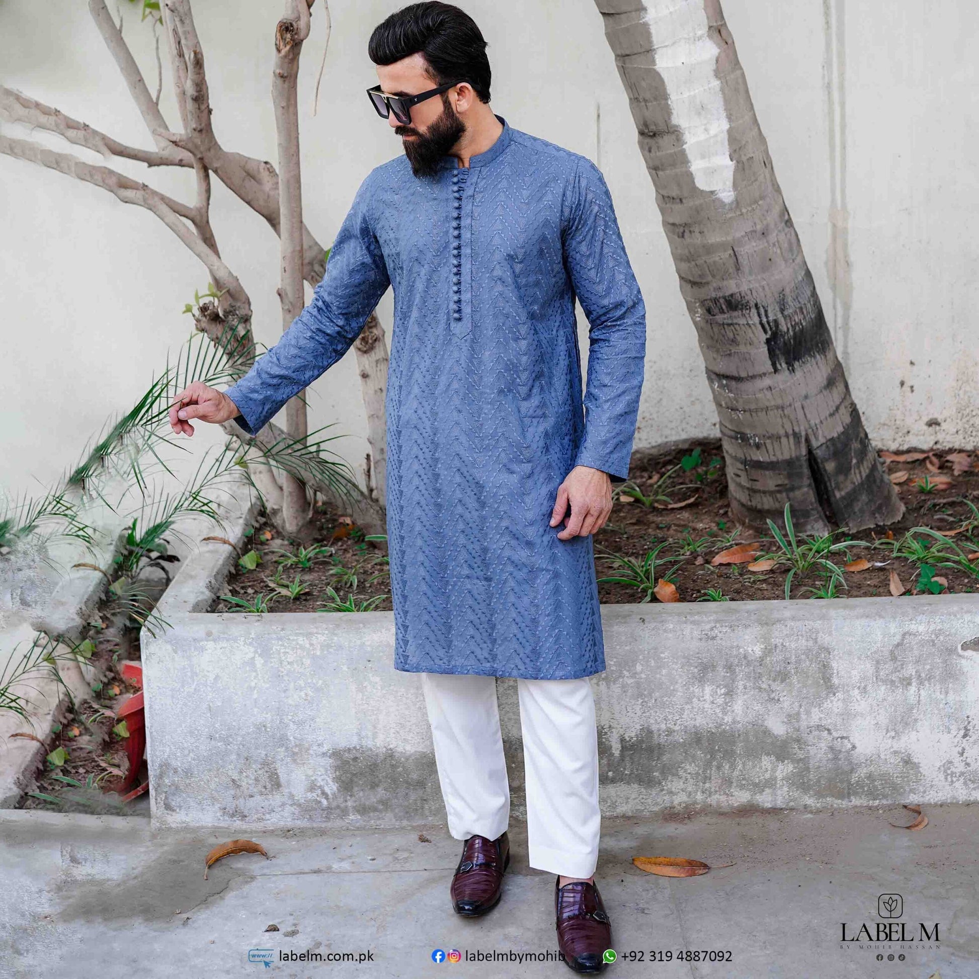 The classic faded blue color makes it versatile for various occasions, whether it’s a casual gathering or a formal event. The chikankari work adds a touch of sophistication and cultural charm to the attire. It’s a timeless piece that will never go out of style.