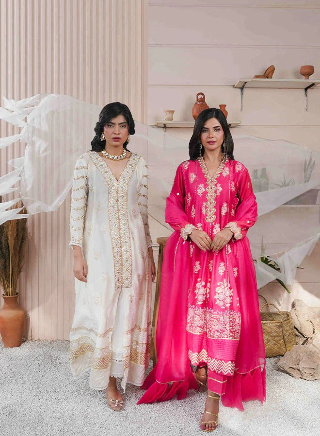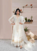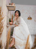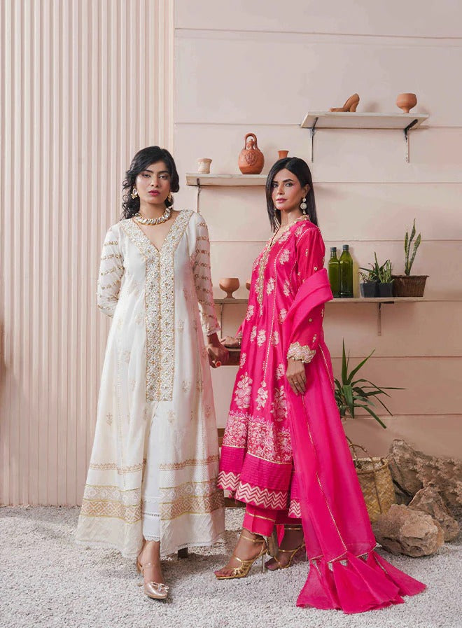 Presenting a must have collection filled with distinctive, quintessentially Kehkeshan prints, masterfully tailored to be worn and cherished for years to come. This off-white cotton silk gown features artfully illustrated block-printed floral motifs, exuding elegance and grace. The neckline is delicately hand worked, adding an intricate touch to the design.