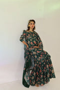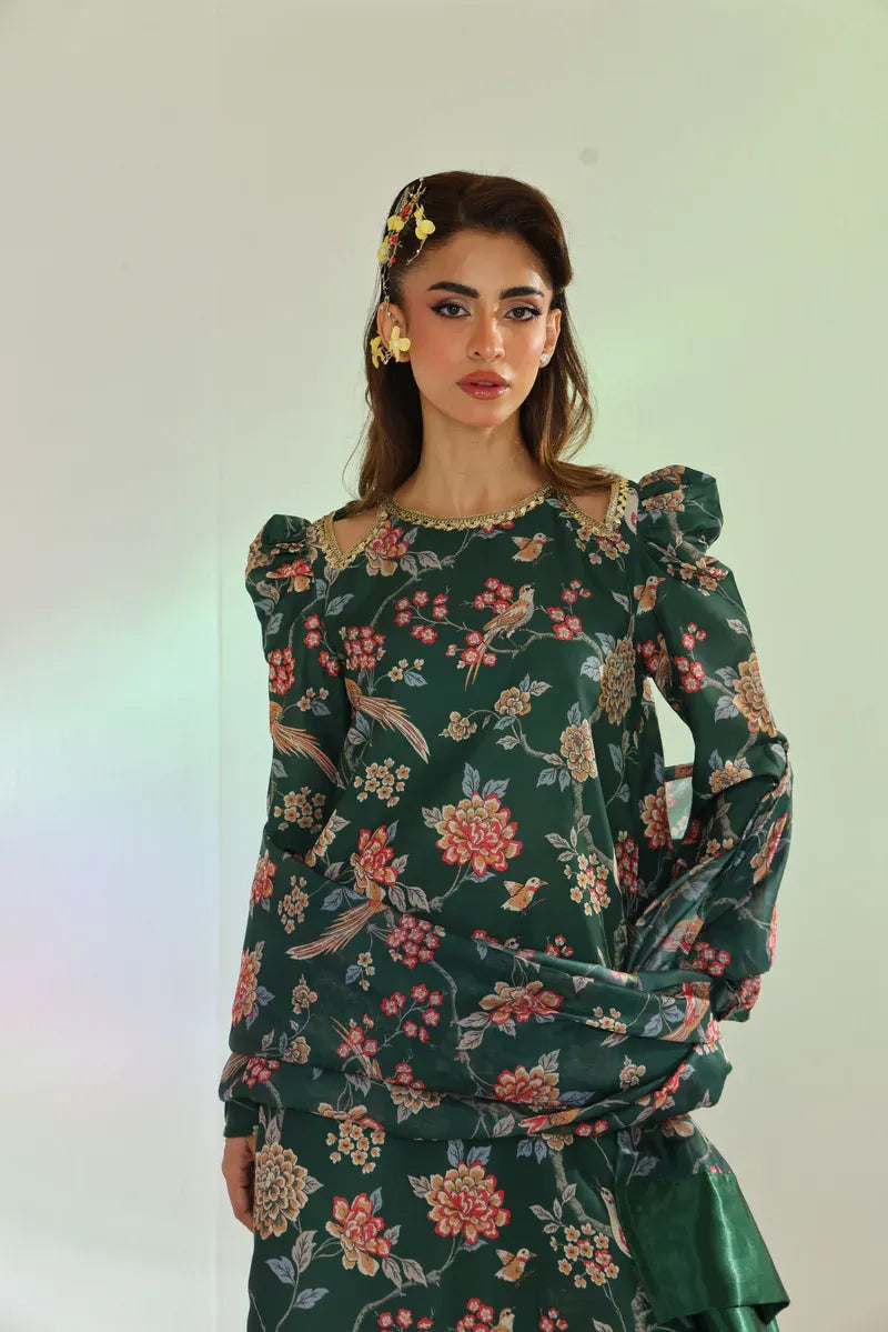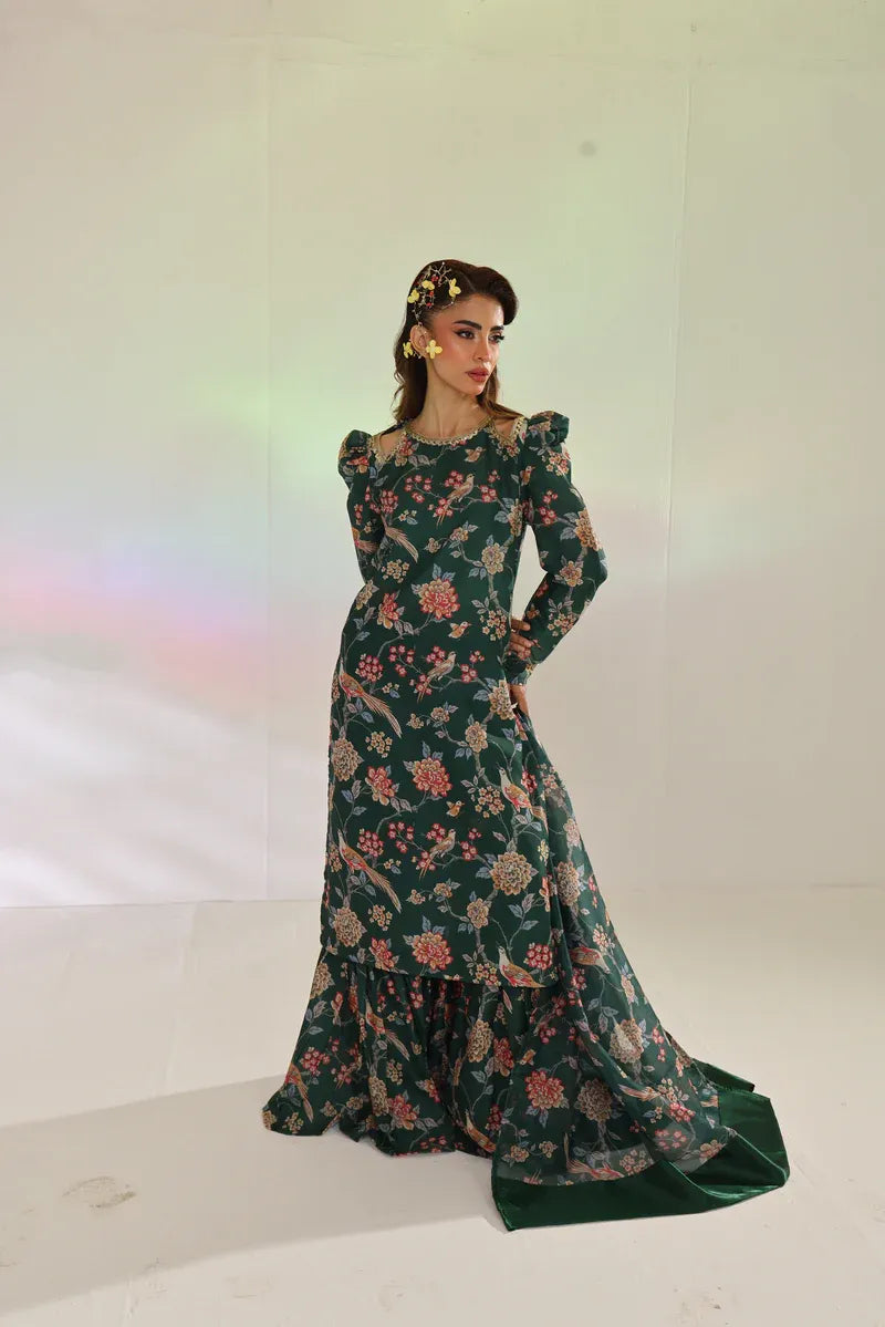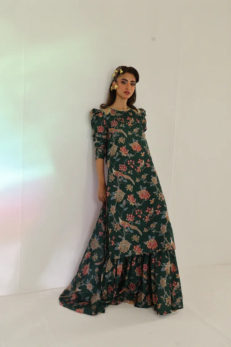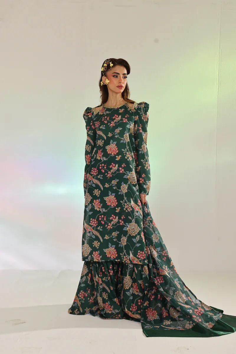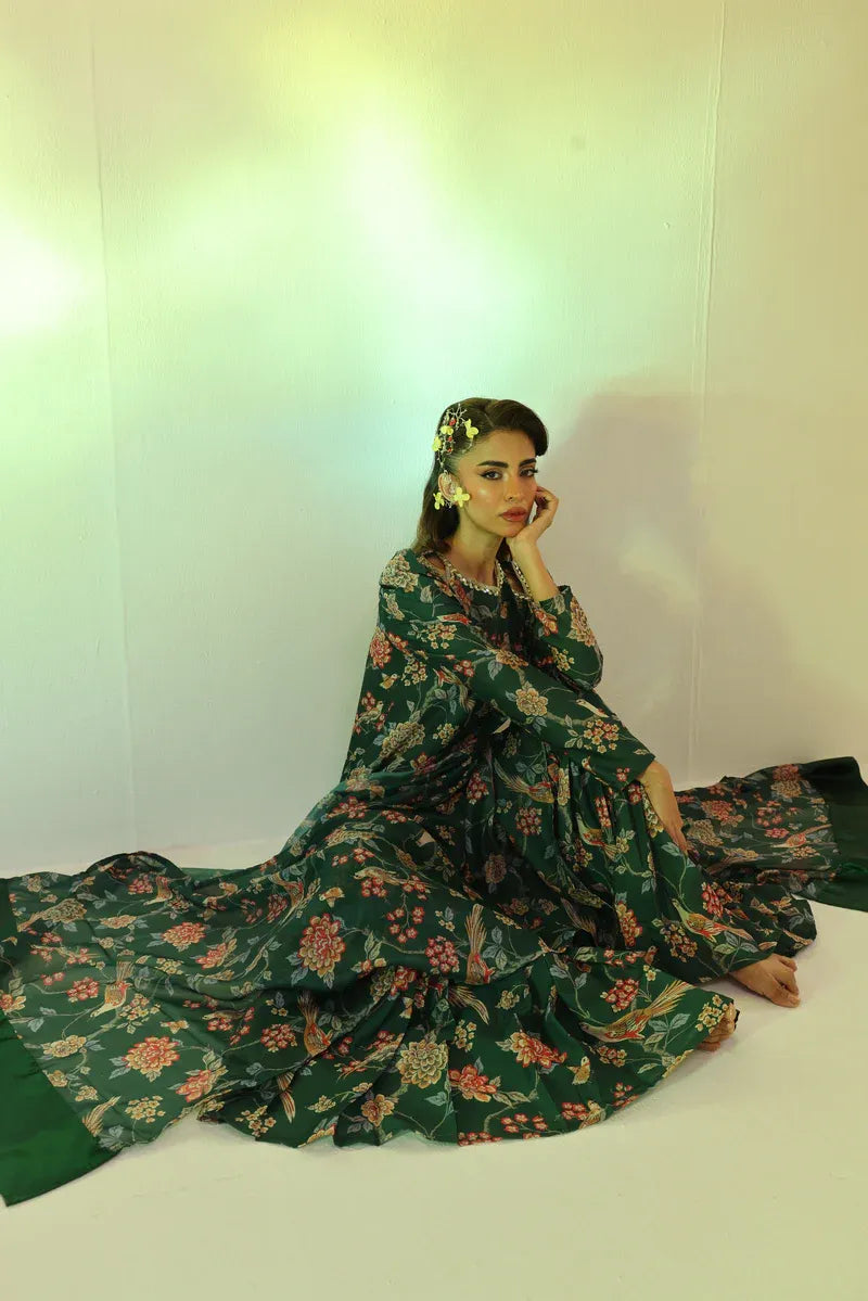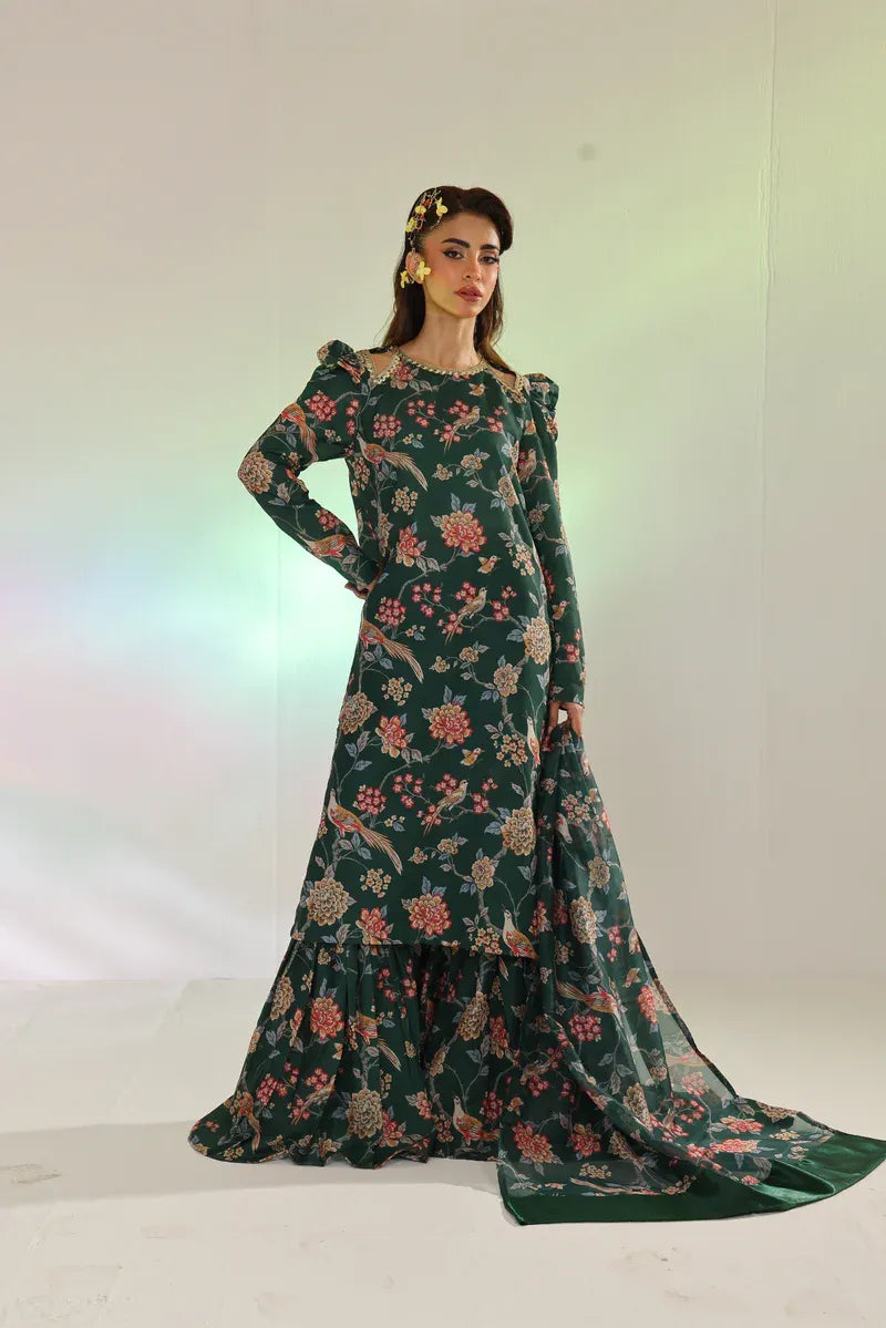 Celebrate Eid in style with this forest green printed set. The long shirt is paired with gharara-style bottoms, and the luxurious silk chiffon dupatta adds the perfect finishing touch.