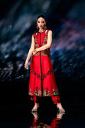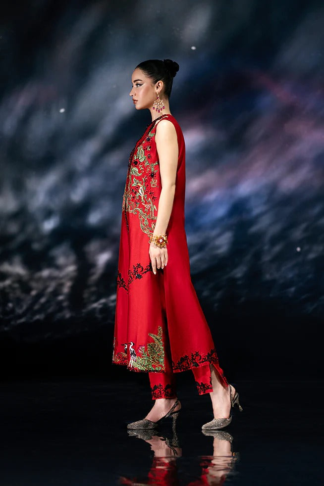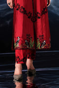 The red silk organza shirt is a masterpiece of craftsmanship, fully embroidered and embellished with meticulous attention to detail. The cutwork neckline is adorned with black sequins and crystals, while the embellished placket, extending from neckline to hemline, showcases the artistry of handcrafted design. Paired with straight cigarette pants in luxurious Pakistani raw silk, featuring sequined embroidery at the bottom.
