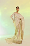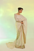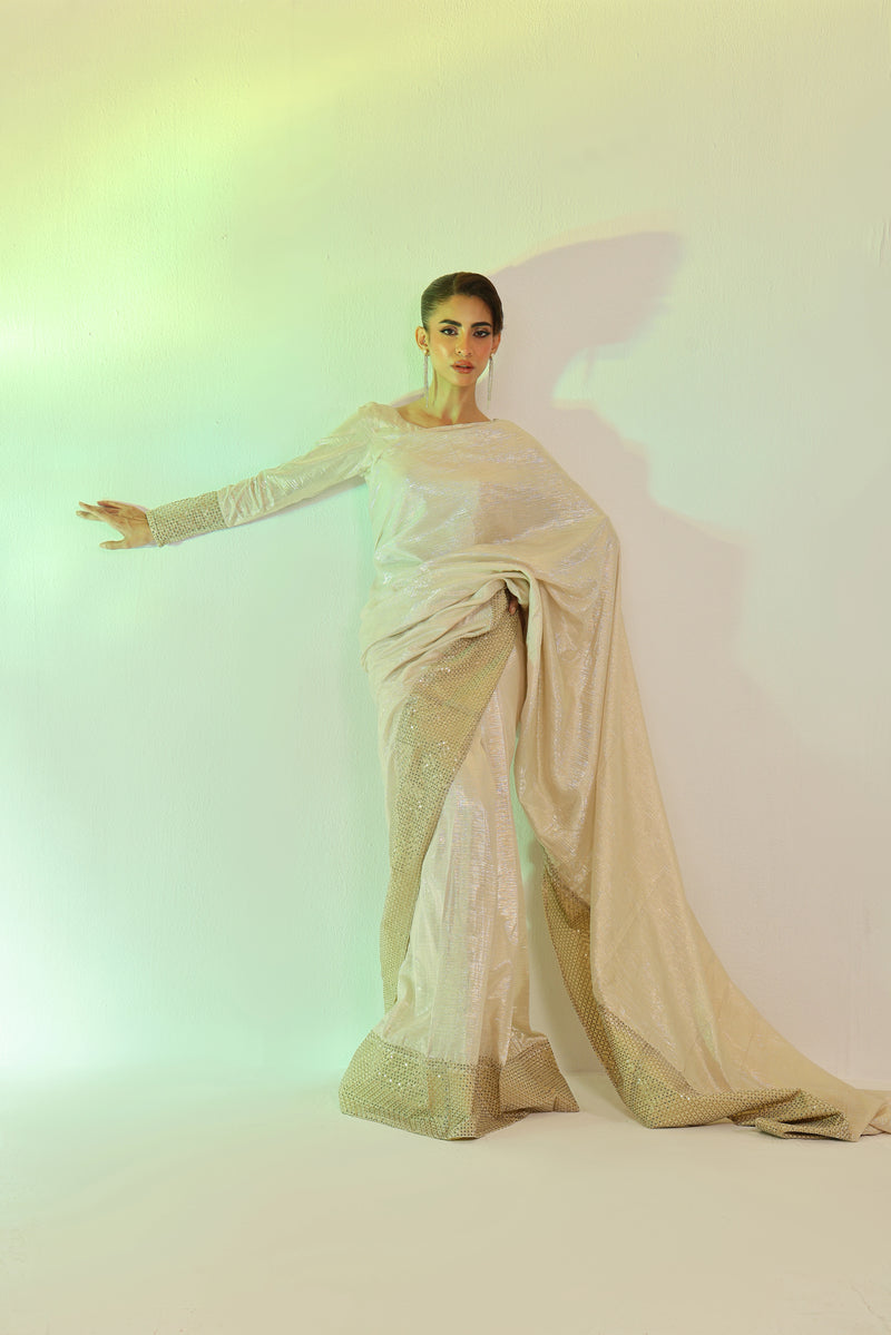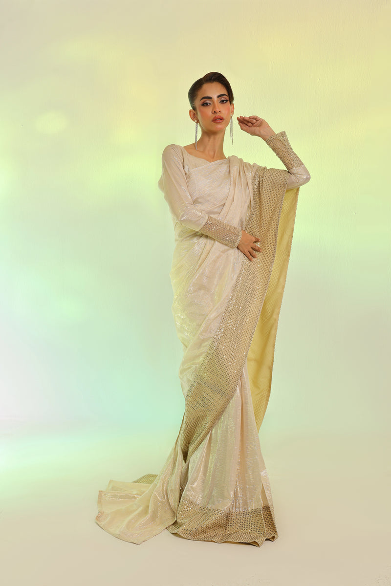 A masterpiece of luminosity, The fabric shimmers with interwoven gold & silver zari, casting a radiant, ever-changing glow. The ethereal chiffon drapes effortlessly, framed by an sequin embroidered organza border for a touch of regal elegance. Paired with a zari chiffon blouse and a soft malayi petticoat, it’s the epitome of refined luxury.