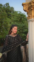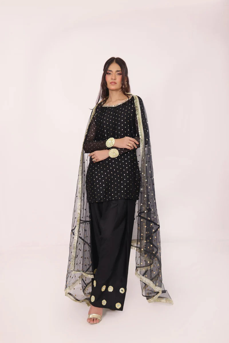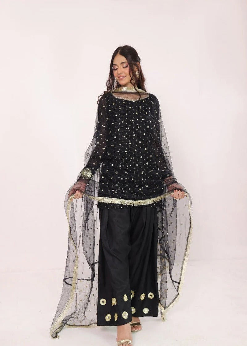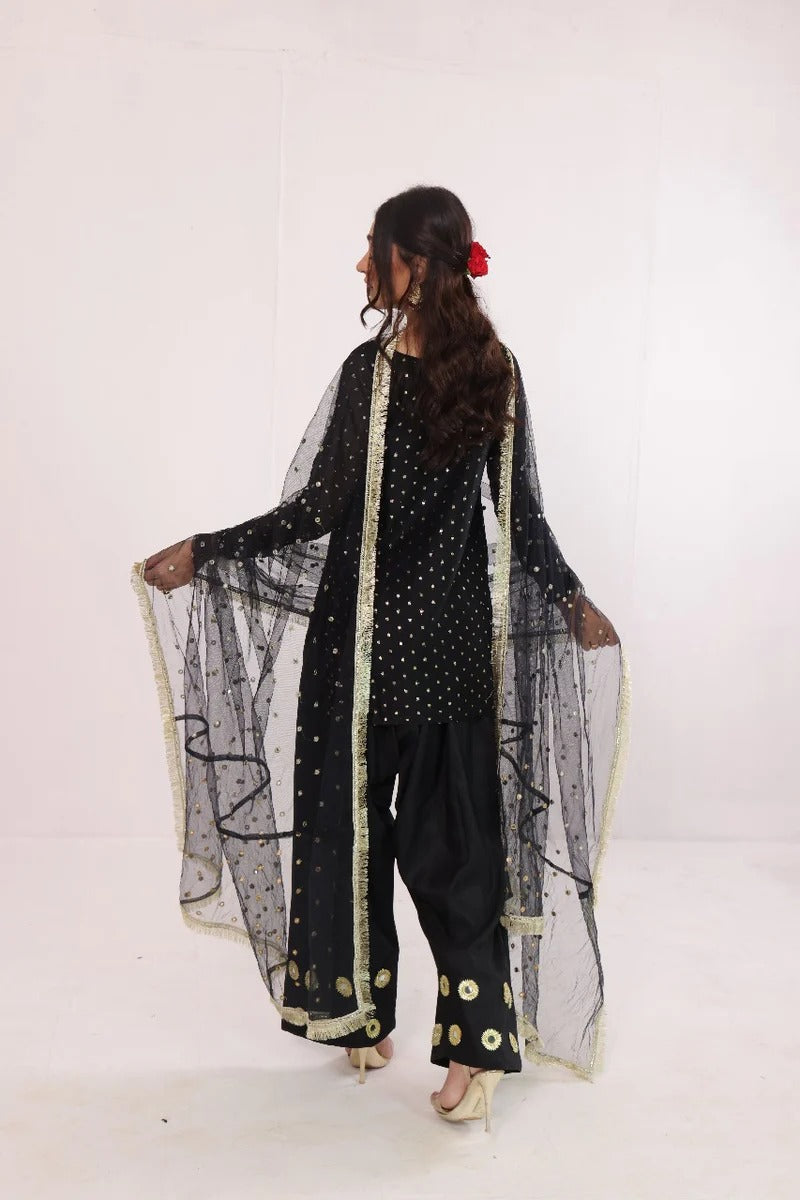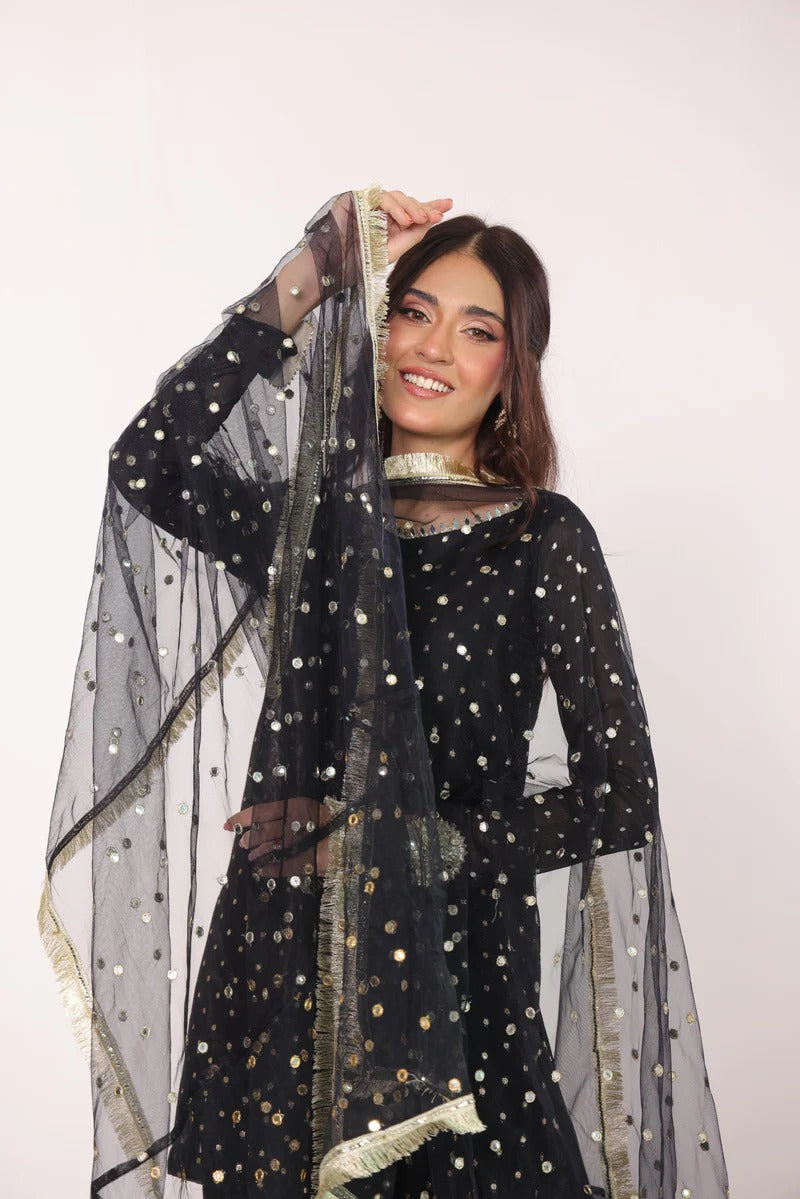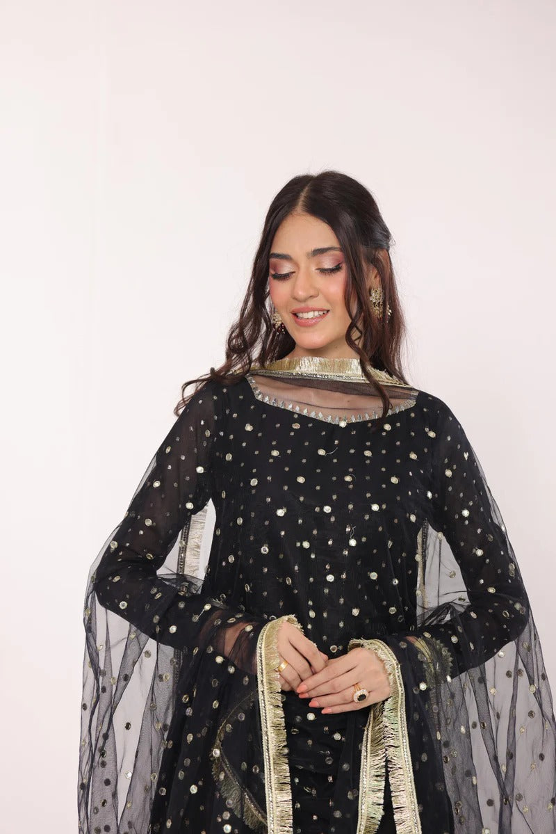 The set is paired with a sequin embroidered net dubatta, detailed with gold lace on all 4 sides, along with a raw silk farshi shalwar, detailed with gota mirrors.