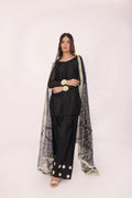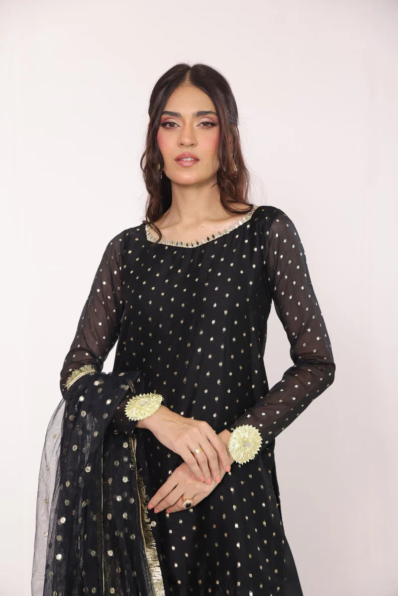 This exquisite 3-piece set is designed for refined elegance. It features a chiffon Banarsi shirt with a soft inner lining, adorned with mirror lace detailing at the neckline and intricate gota phool embellishments on the sleeves.