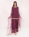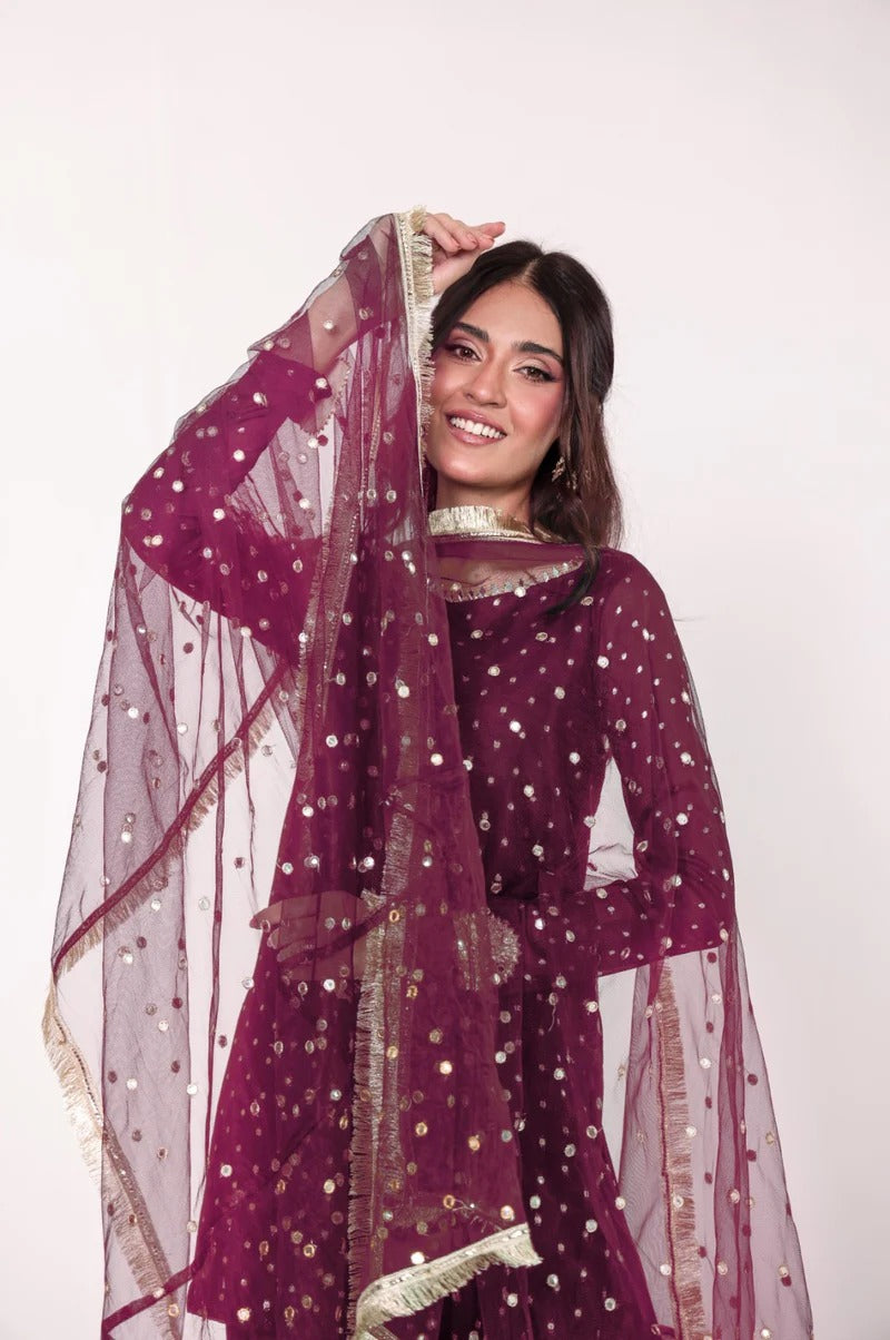 The set is paired with a sequin embroidered net dubatta, detailed with gold lace on all 4 sides, along with a raw silk farshi shalwar, detailed with gota mirrors.