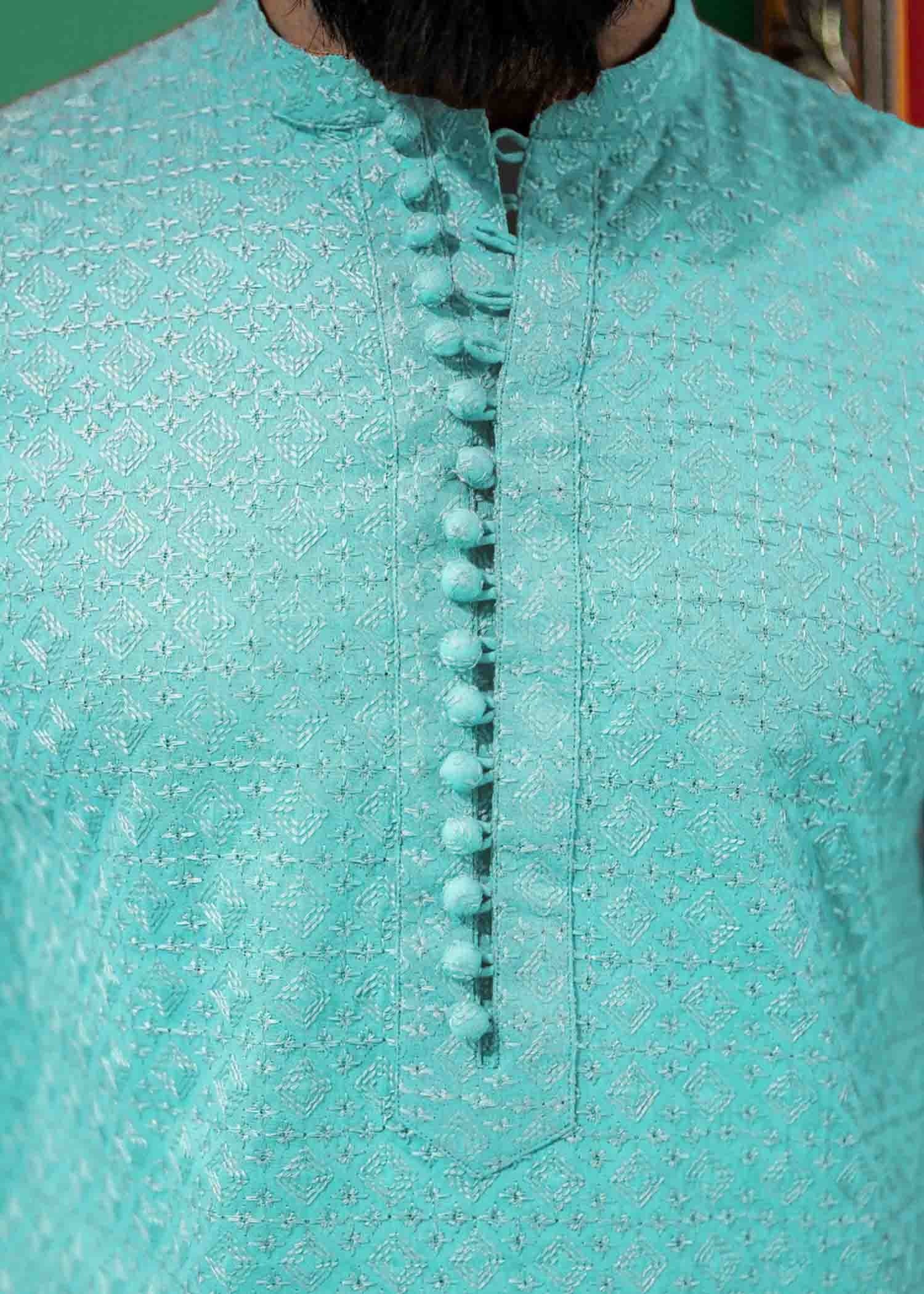 The classic ice blue color makes it versatile for various occasions, whether it’s a casual gathering or a formal event. The chikankari work adds a touch of sophistication and cultural charm to the attire. It’s a timeless piece that will never go out of style.