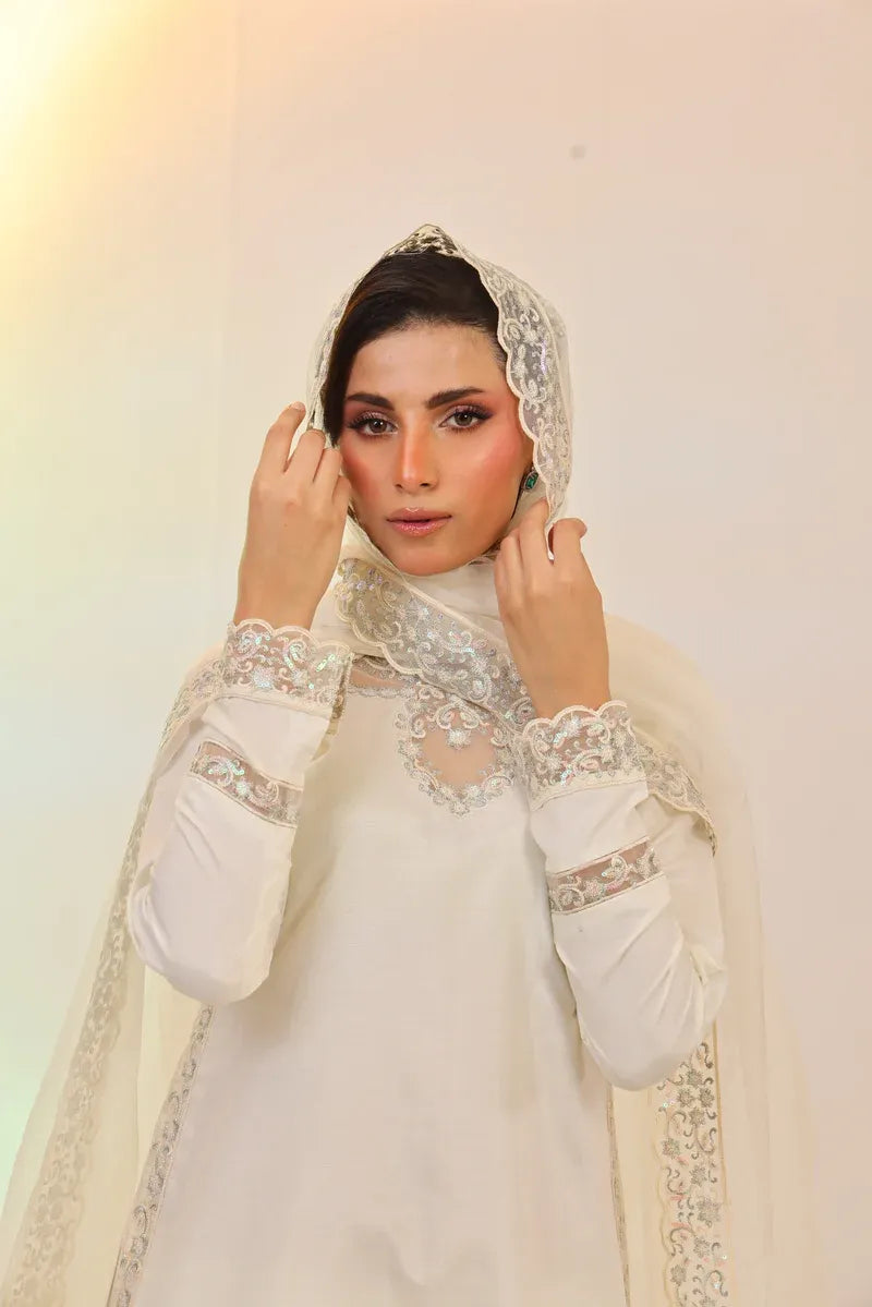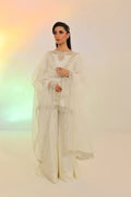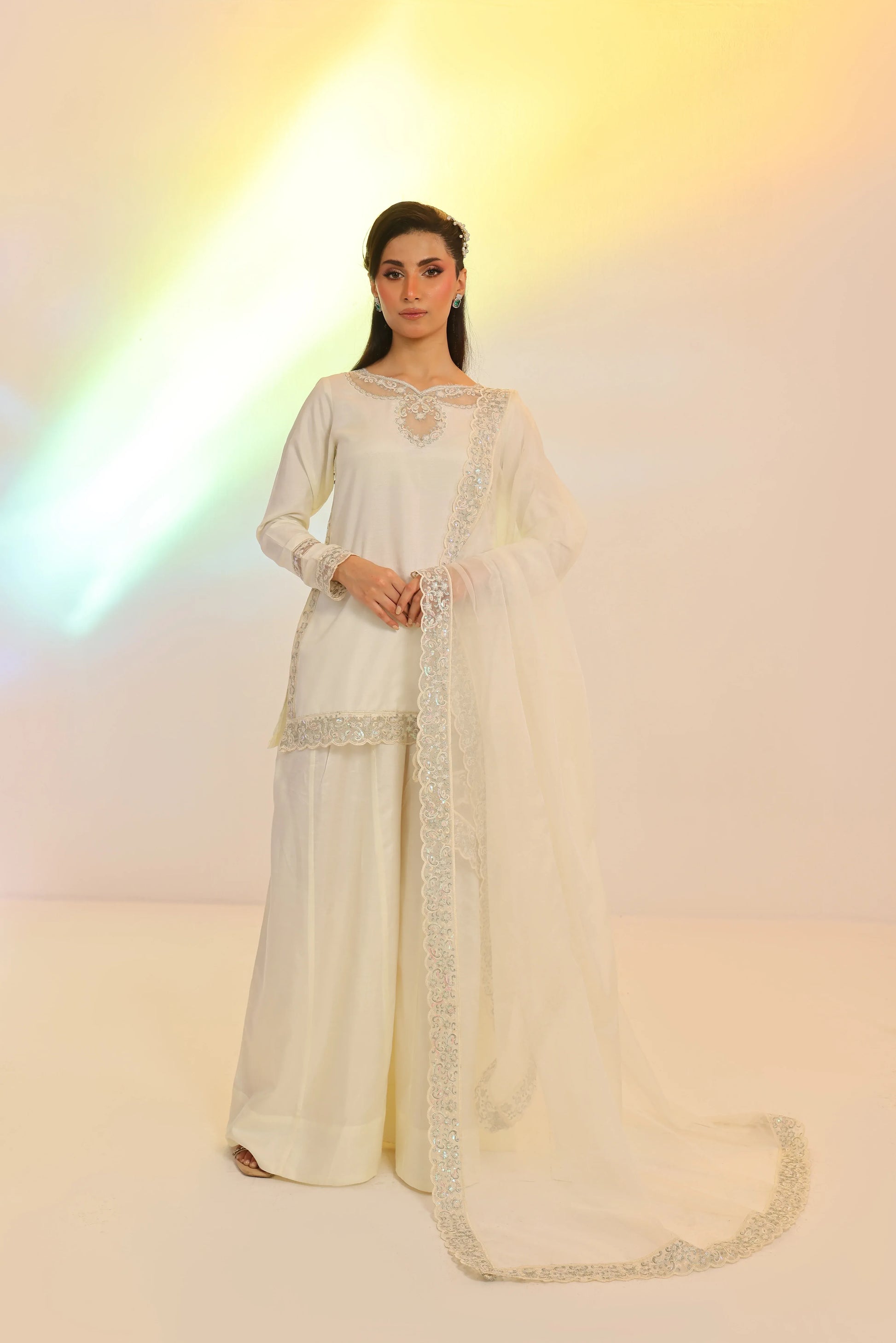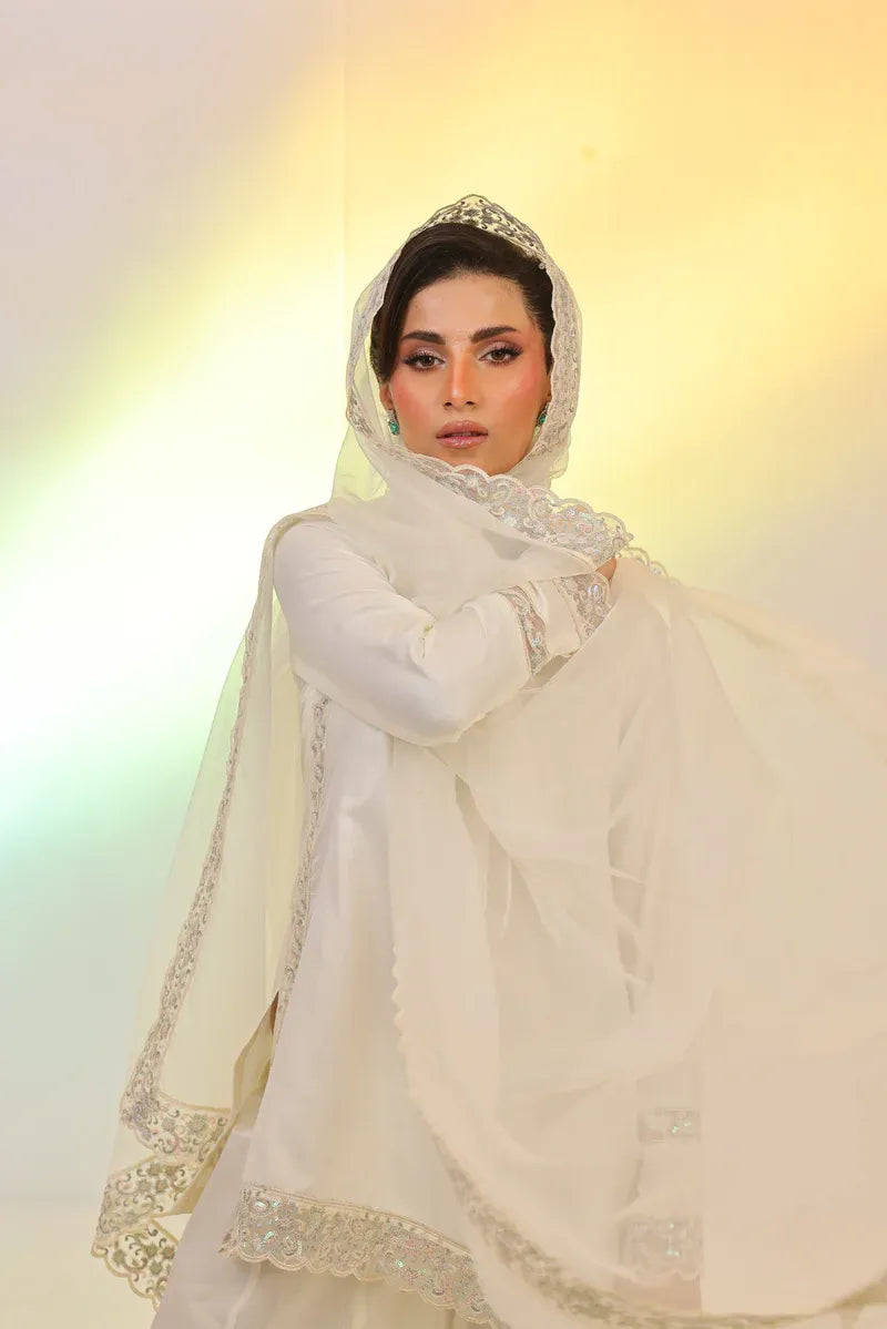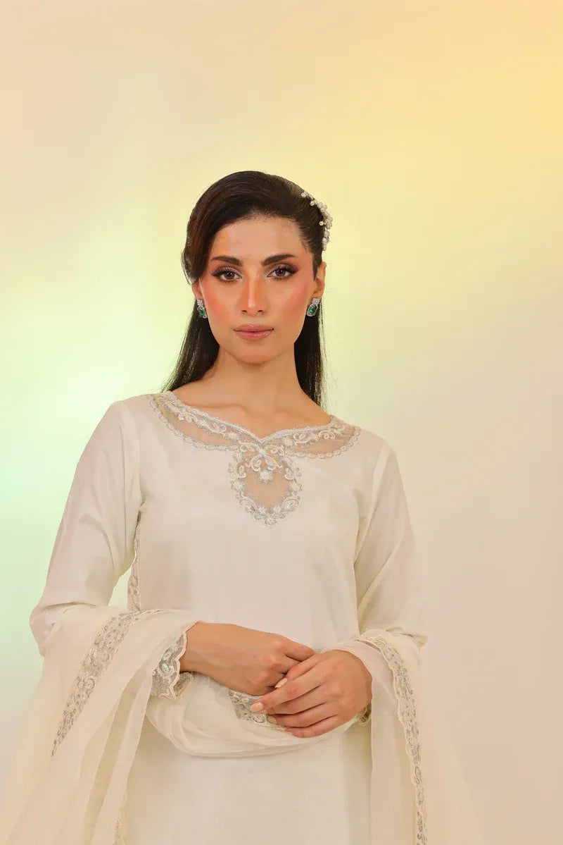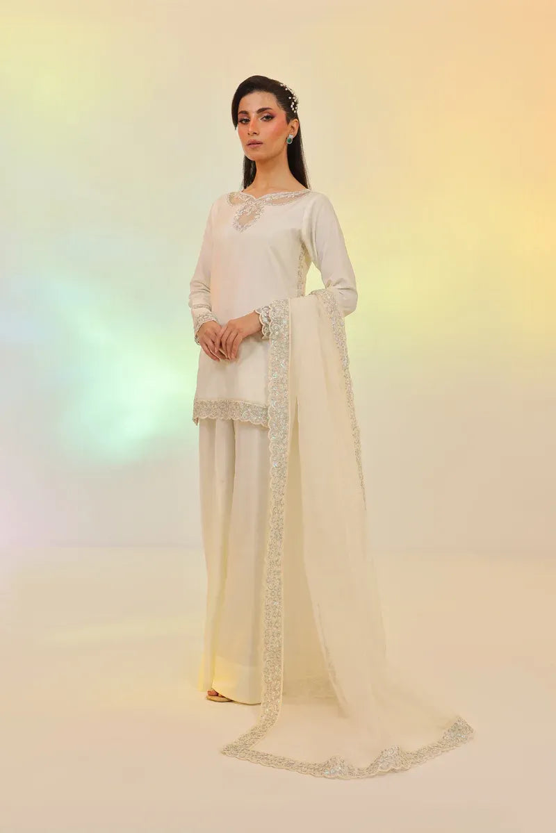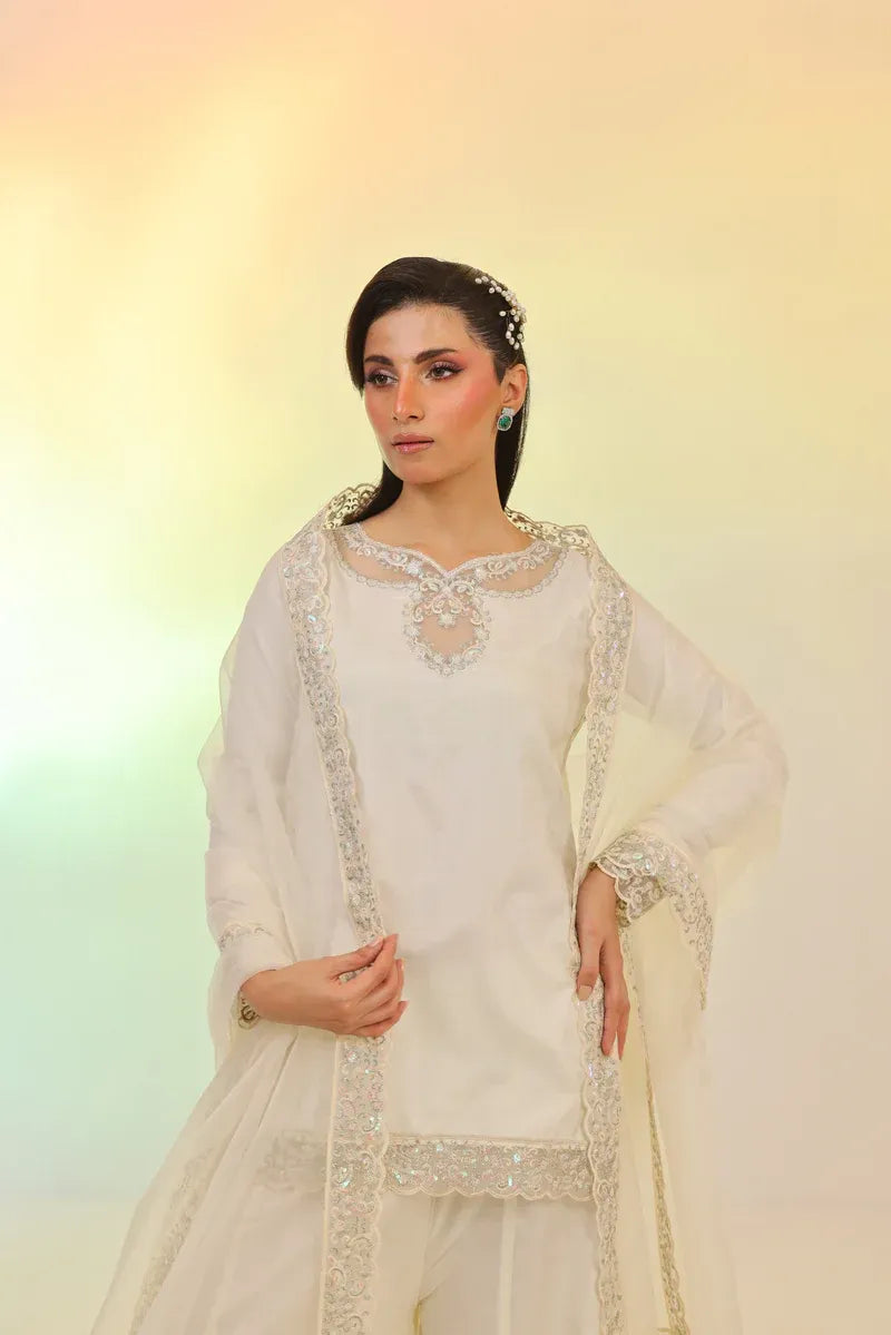 This chic ivory 3-piece set features a short embroidered shirt paired with flared dhaka pants in solid Russian silk. The look is completed with a luxurious organza dupatta, detailed with multi-shaded sequins embroidery.