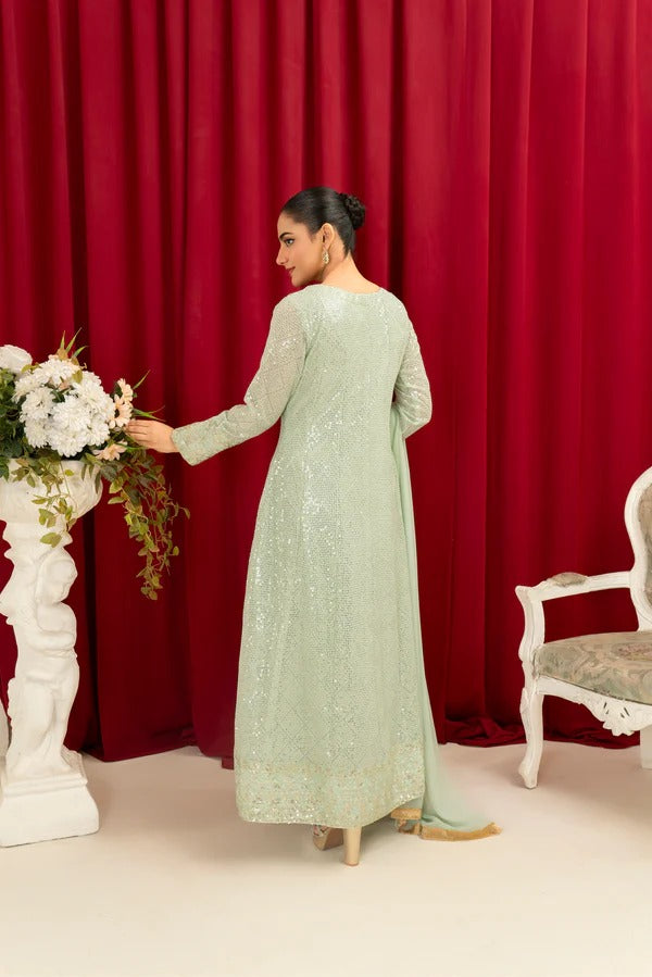 Gender: Women Category: Clothing Outfit Type: Eastern Ready to wear Sub-Category: Gown Bottom Style: Trouser Color Type: MINT GREEN Dupatta Fabrics: Chiffon Lining Attached: As shown in Picture Number of Pieces: 4 Piece - Top + Bottom + Outerwear + Dupatta Product Type: Festive/Party Wear Season: All Season Shirt Fabrics: Chiffon Top Fit: Loose Fit Trouser Fabrics: Crepe Work Technique: Embellished Disclaimer: Actual product color may vary slightly from the image