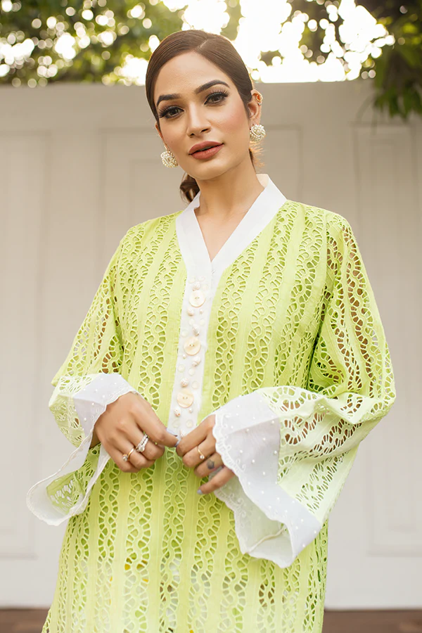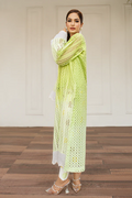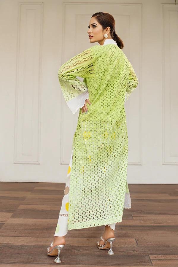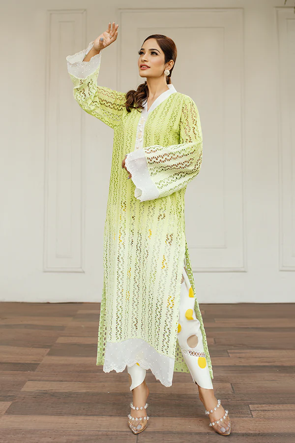 Redefine your seasonal style statement with "Limelight", a Cutworked Chikan kari canvassed ombré mint shirt half-lined till waist on lawn fashioned with scalloped organza hemline and sleeves embellished with pearls and a neckline adorned with shells, buttons, pearls, and fur. Paired with our funky cotton polka dots shalwar create a flattering look for your seasonal gatherings.