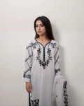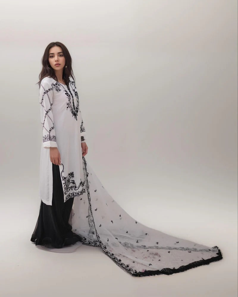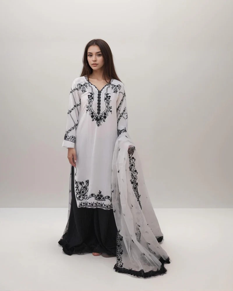 This straight-cut, relaxed-fit kurta is beautifully embroidered with black thread detailing, exuding elegance and charm. The 2.5-yard dupatta enhances the look with its two-sided embroidery and crochet lace embellishments, making it a versatile choice for festive and semi-formal occasions.