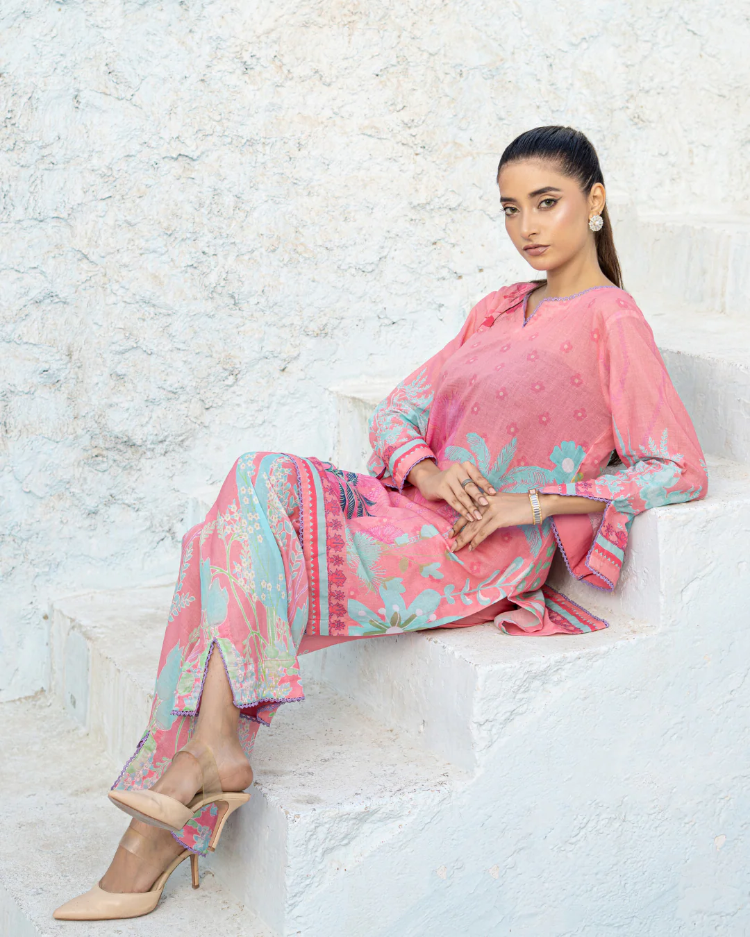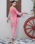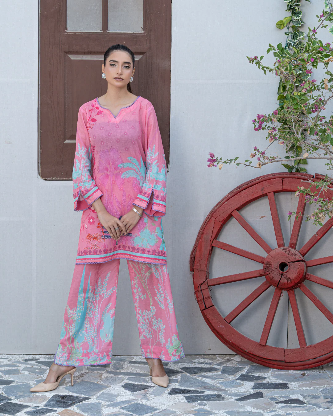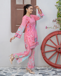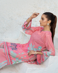 Meerab from our Aiwish Prints lawn collection blends timeless charm with modern flair a beautifully stitched 2 piece co-ord set featuring a straight cut kameez and culottes in a soft pink floral digital print, enhanced with delicate lace detailing.