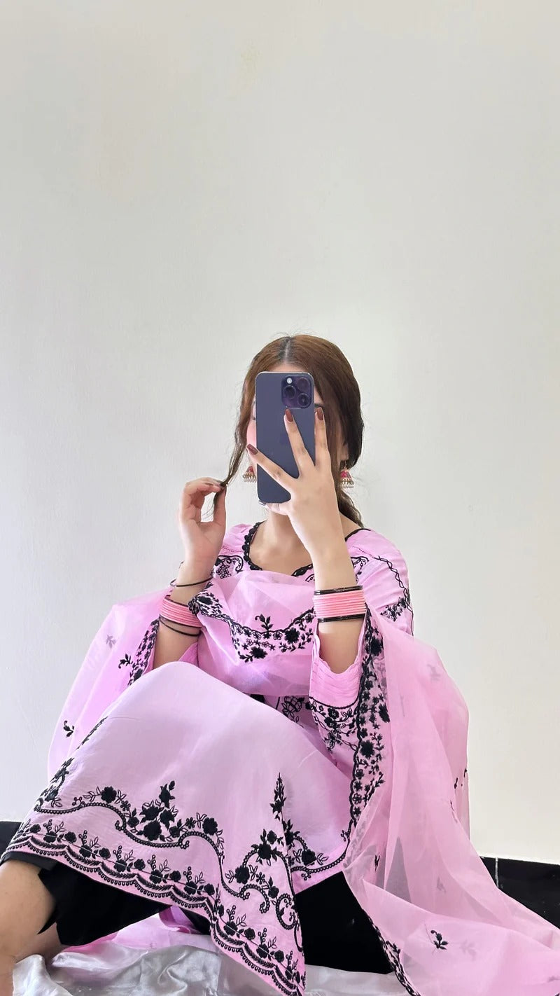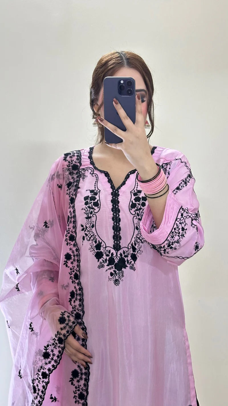 This straight-cut, relaxed-fit kurta is beautifully embroidered with black thread detailing, exuding elegance and charm. The 2.5-yard dupatta enhances the look with its two-sided embroidery and crochet lace embellishments, making it a versatile choice for festive and semi-formal occasions.