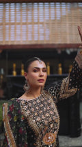 Step into the world of 'Koyal,' an ensemble as captivating as a melodious bird's song, in a stunning kohl-hued color. The silk embroidered shirt is a masterpiece of craftsmanship, featuring hand-embellished ada-work, delicate sequin work, and enchanting card mirror work, elegantly contrasted by satin silk borders.The ensemble is beautifully completed with a silk gharara boasting a floral print and a satin silk embroidered border, adding a touch of whimsical elegance. The printed and embroidered dupatta, with its four-sided satin embroidered border, is the final note in this symphony of style. 'Koyal' is a celebration of grace and artistry, the perfect choice for brides who seek timeless beauty with a touch of the extraordinary.