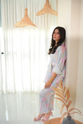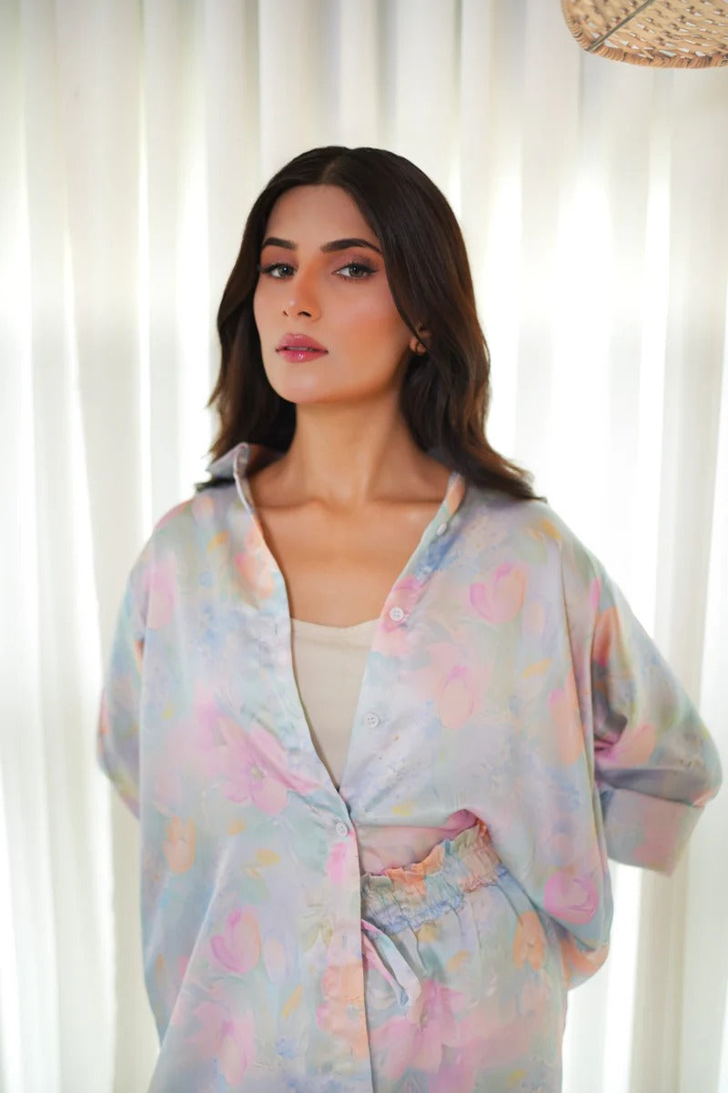 Step into refined elegance with our florence silk matching cord set in a dreamy pastel floral print. The button-down shirt exudes sophistication with its smooth, flowy silhouette, while the straight-cut trousers provide a sleek and comfortable fit