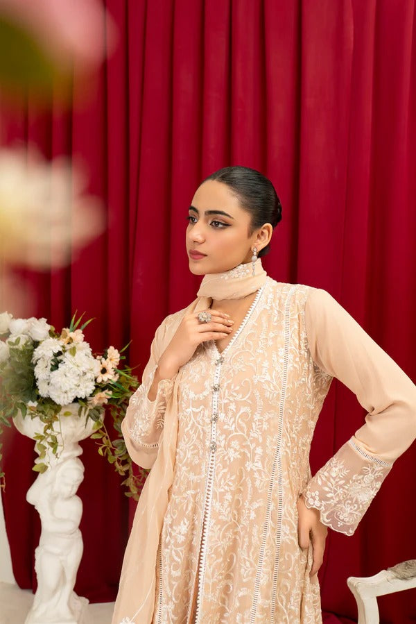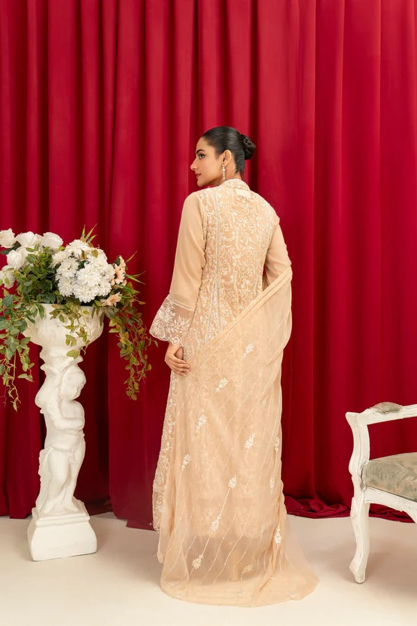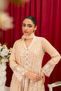 Additional Description: Step out in style with our latest front open shirt coupled with separate chiffon inner. The embroidery is crafted with resham , lace which is giving an elegant touch to this gorgeous outfit. This sophisticated shirt is paired with a narrow crepe pant .The design serves as the ultimate look to make a classic entrance in formal gatherings. Note: Measurements very according to designs .Trouser patches change in every dress. Remember: Dry Clean Only.