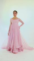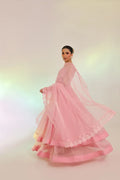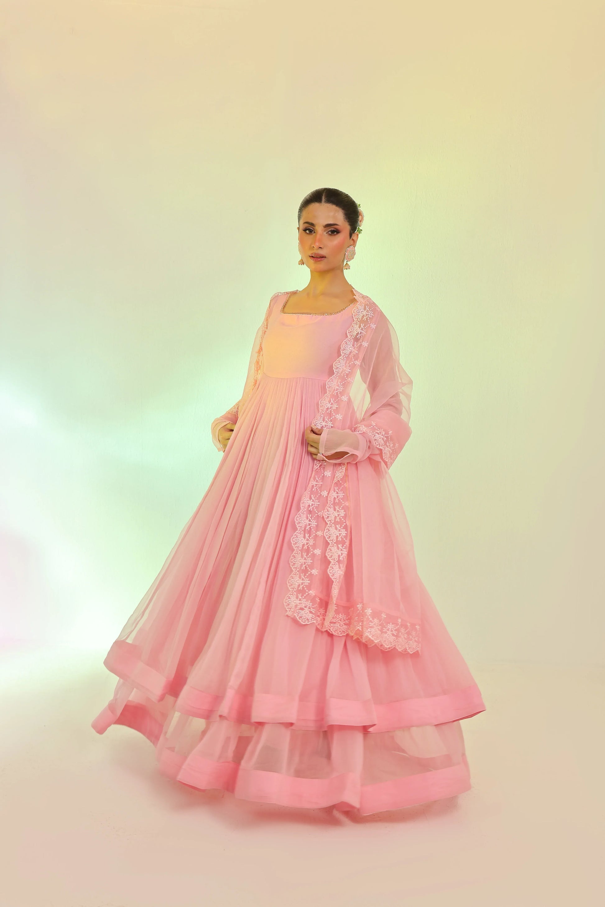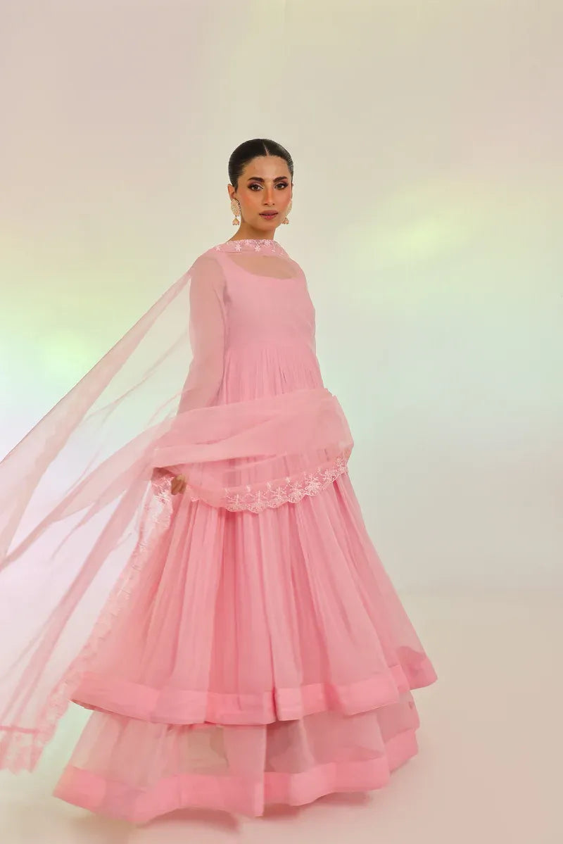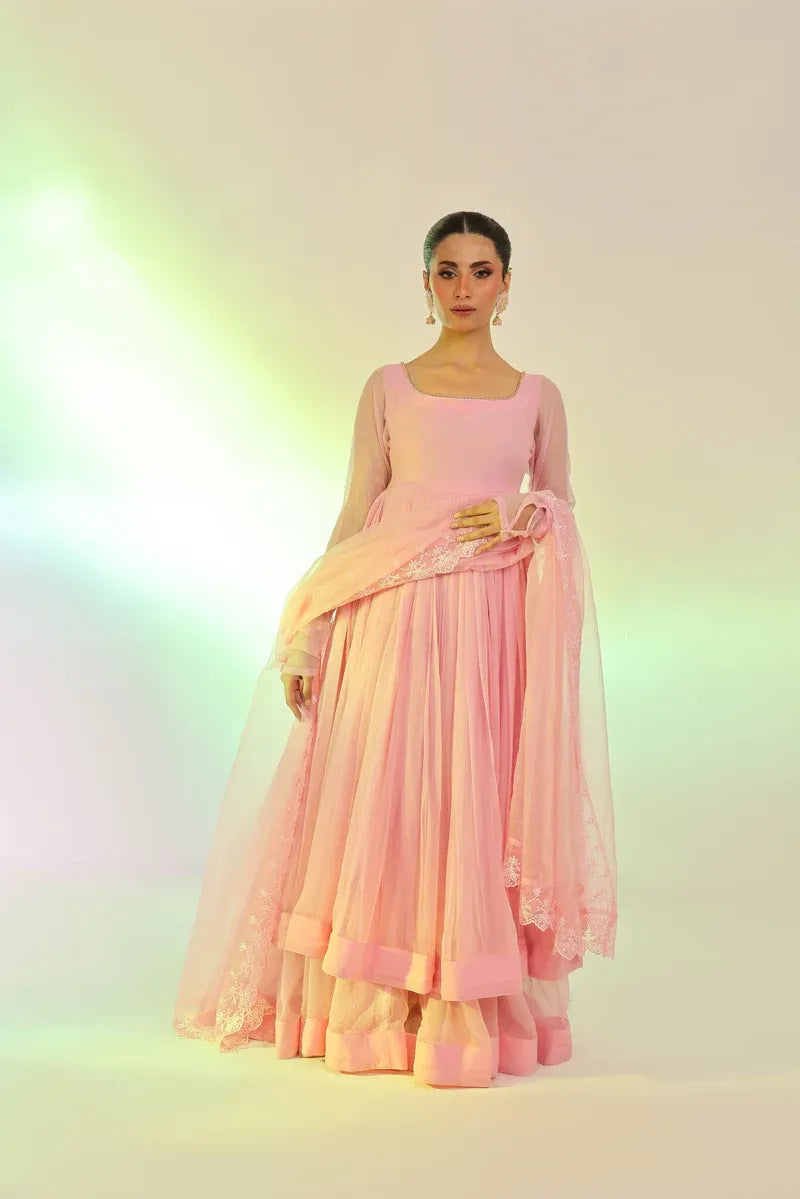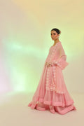 This Flowy set features a crinkle chiffon frock with a remarkable two-tier design that creates an incredible 350+ inches of flare, made with over 20 yards of fabric. The neckline is detailed with crystal laces. Fully lined with Malayi fabric for comfort, this frock offers a voluminous and graceful silhouette. Paired with a soft organza dupatta, featuring a four-sided lace border, this ensemble is perfect for a sophisticated and flowing look.