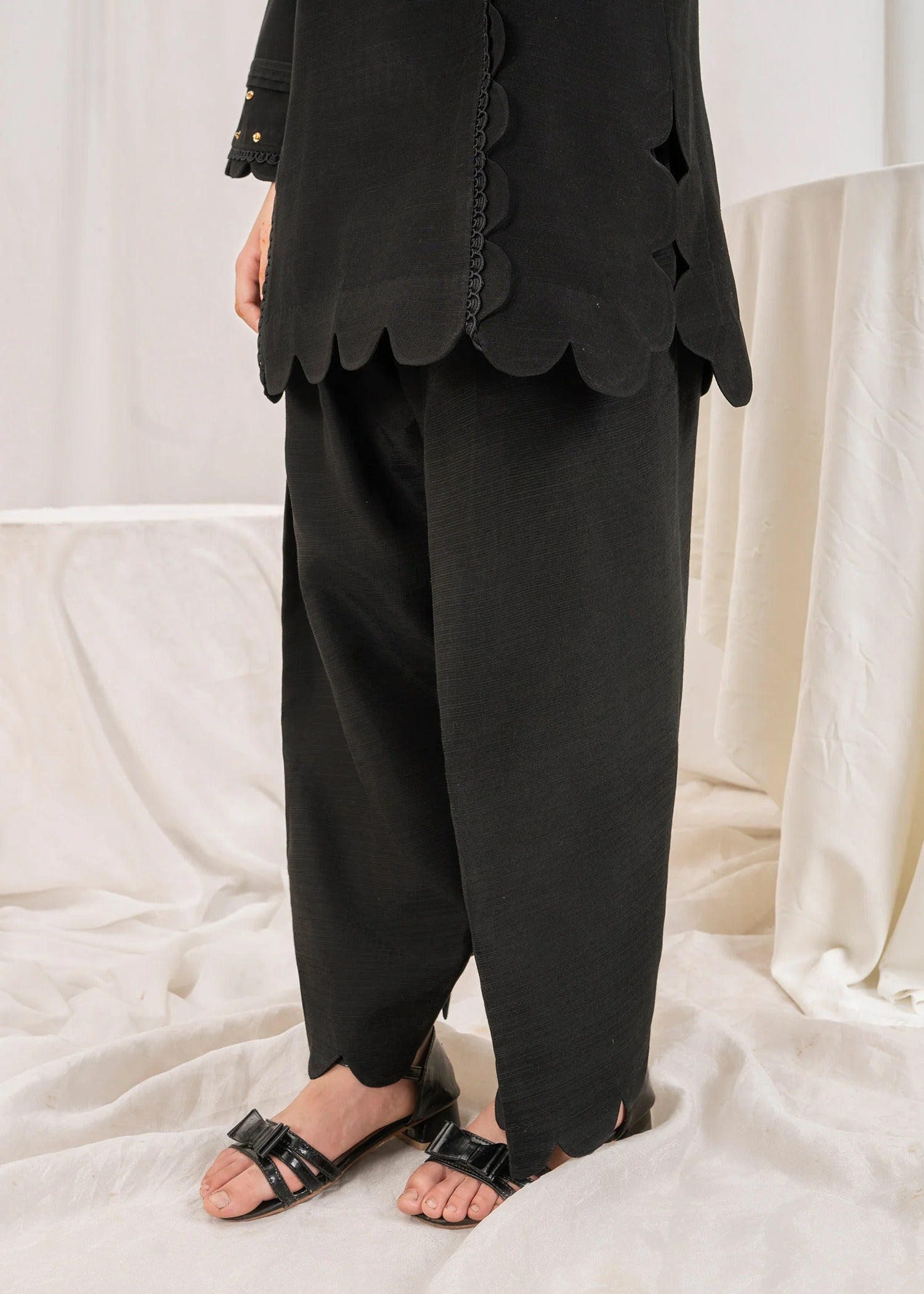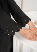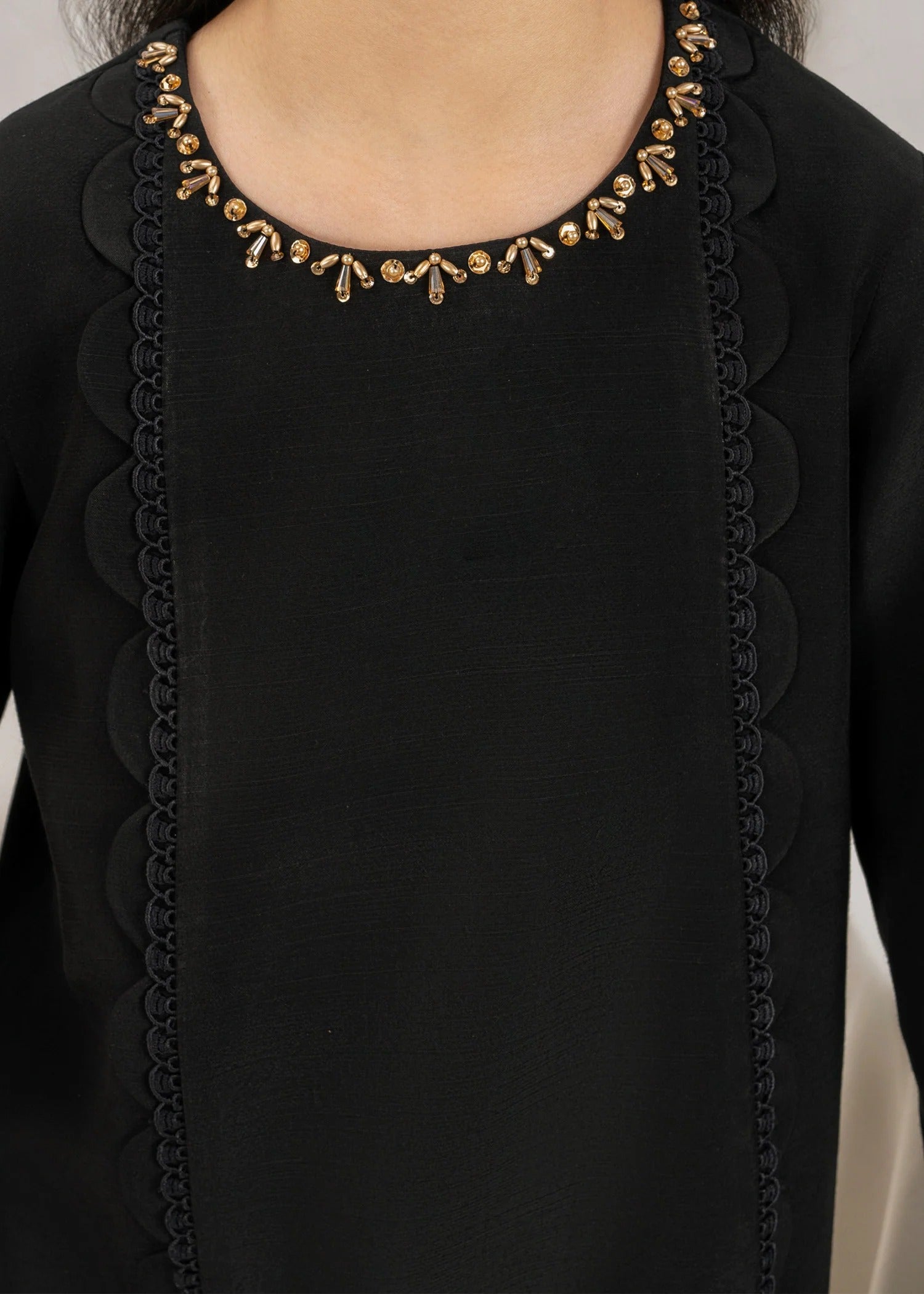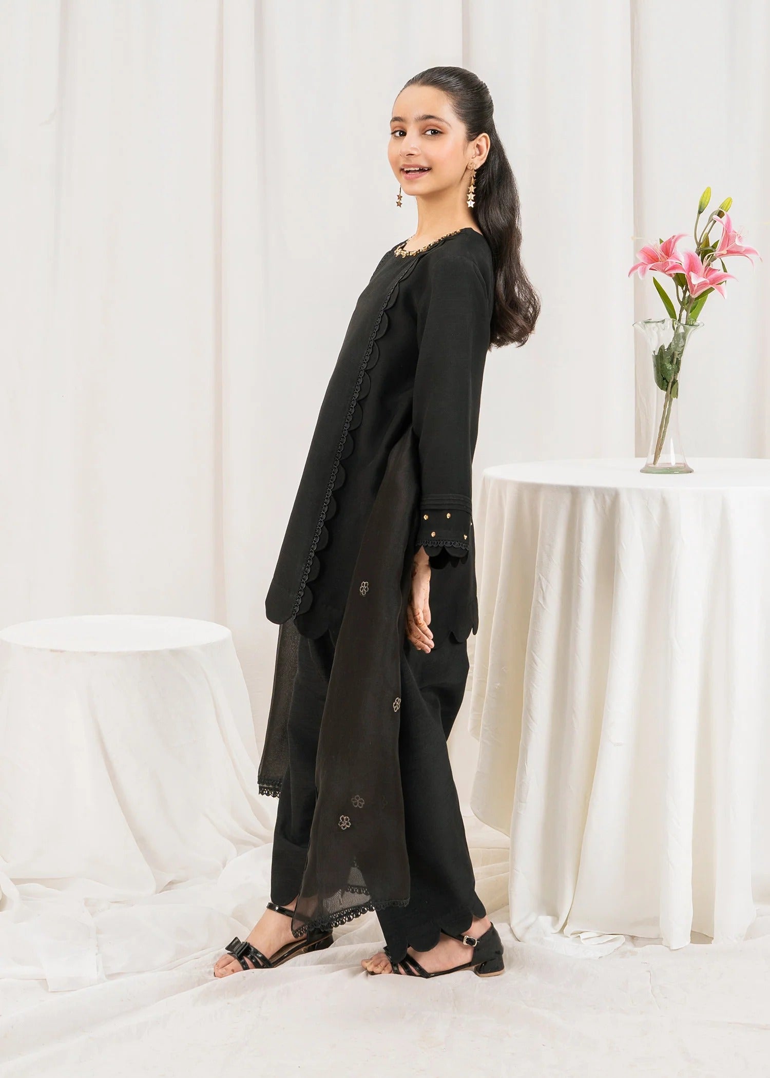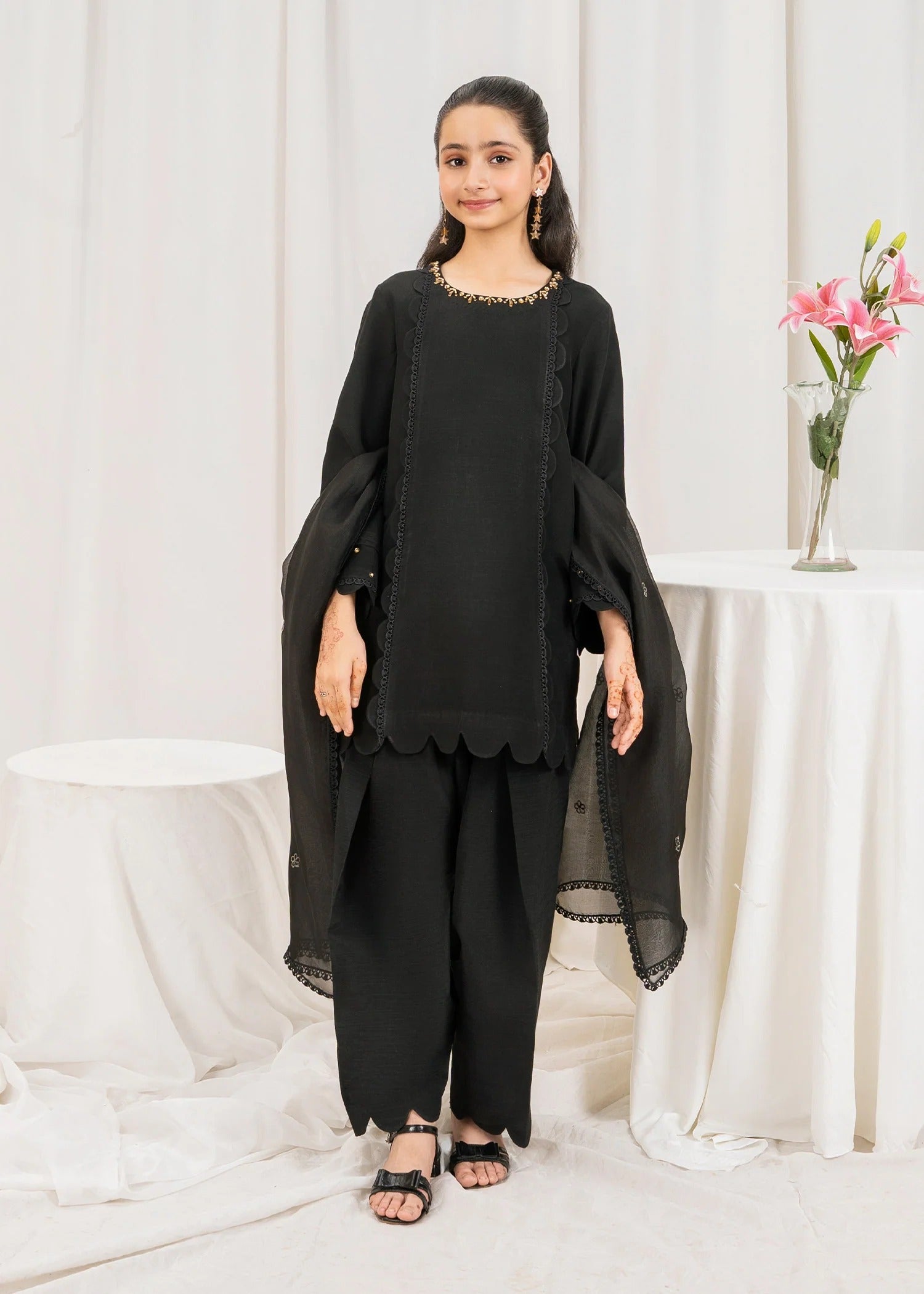 This black 3 piece embroidered silk dress for kids with an organza dupatta is the perfect fusion of classic sophistication and graceful detailing. Crafted from luxurious silk, the shirt features elegant embroidery that adds richness and texture to its timeless black base. Paired with sleek matching trousers, the ensemble creates a refined silhouette ideal for formal or festive occasions. The look is beautifully completed with a sheer embroidered organza dupatta, adding a touch of delicacy and elegance. Whether for a special evening event or a traditional celebration, this outfit offers a poised and polished statement.