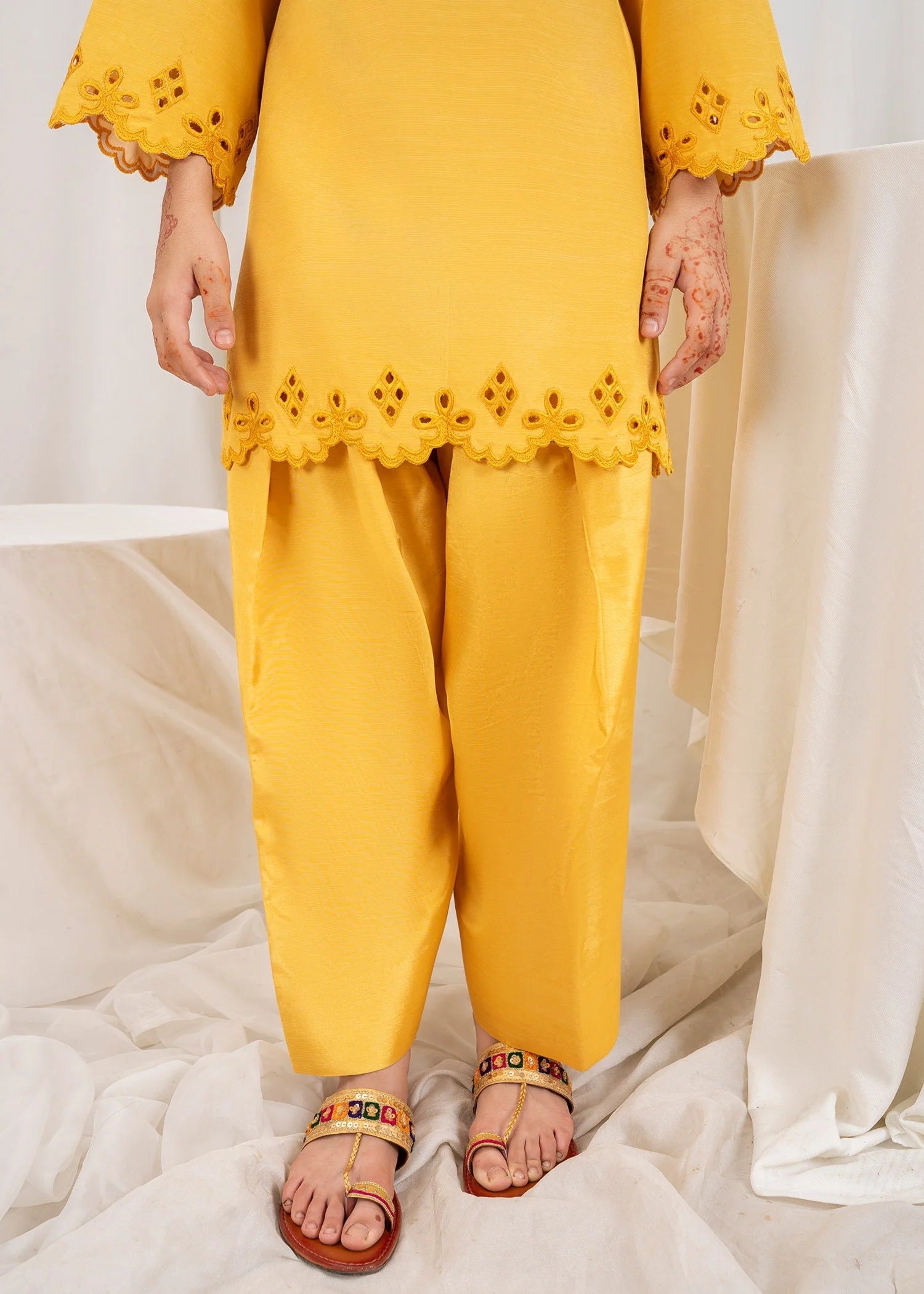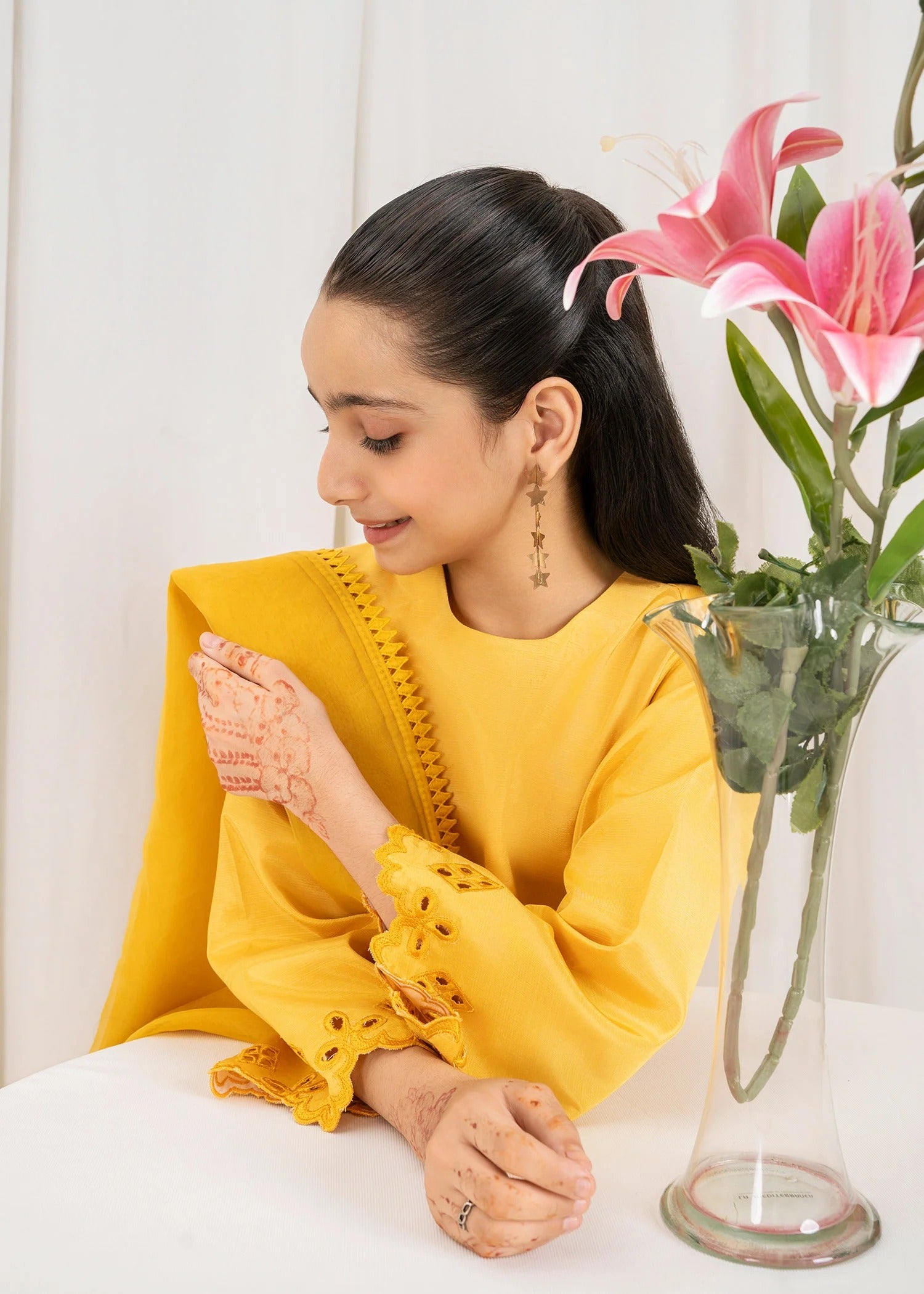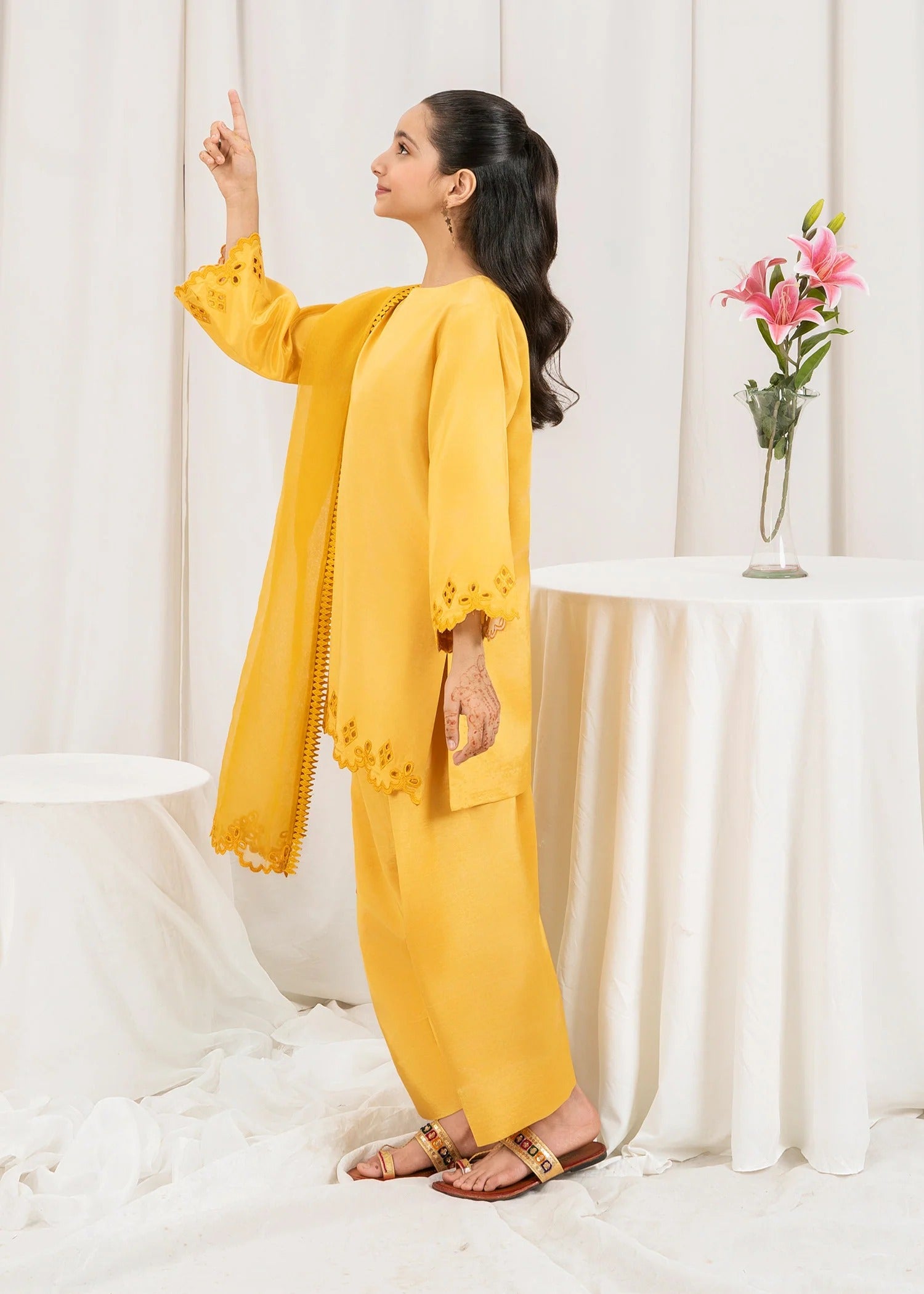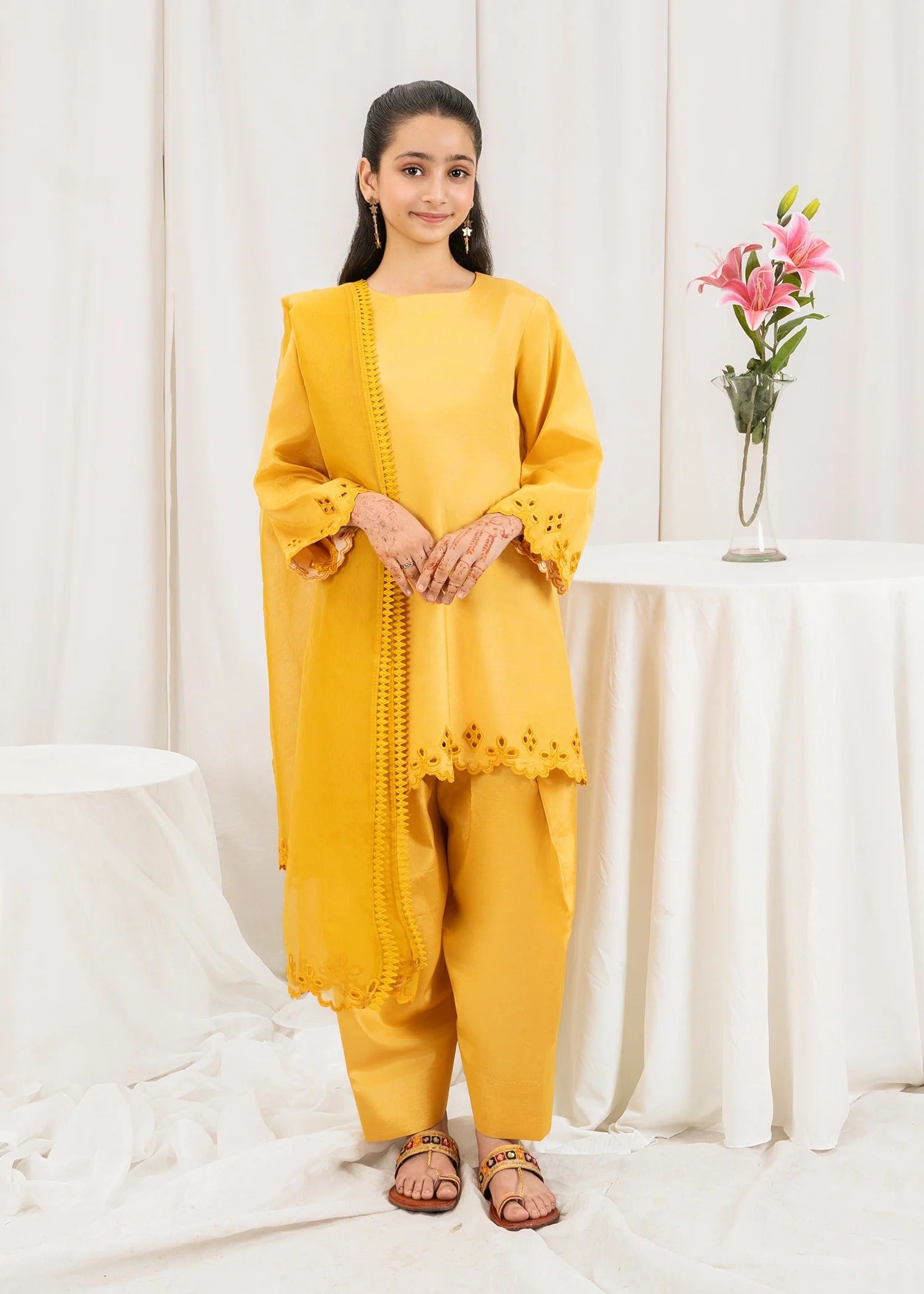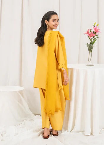 This mustard 3 piece embroidered silk dress for kids is a striking fusion of elegance and tradition. Made from luxurious silk, the ensemble features a richly embroidered shirt that showcases intricate patterns and fine craftsmanship. The warm mustard tone adds vibrance and depth, making it a standout choice for festive occasions and cultural events. Paired with coordinating silk trousers and a beautifully detailed dupatta, the outfit offers both comfort and sophistication. Perfect for weddings, formal dinners, or festive gatherings, this dress is designed to make a lasting impression with its bold color and graceful detailing.