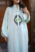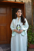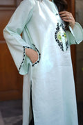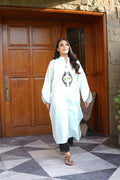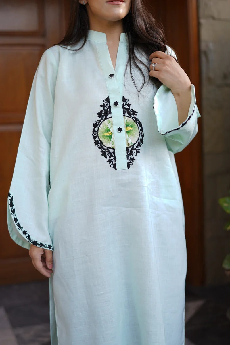 This stylish ensemble features an oversized linen kurta, designed for comfort and elegance. It is adorned with beautifully embroidered pockets and a detailed neckline, adding a touch of intricate craftsmanship to the relaxed silhouette.